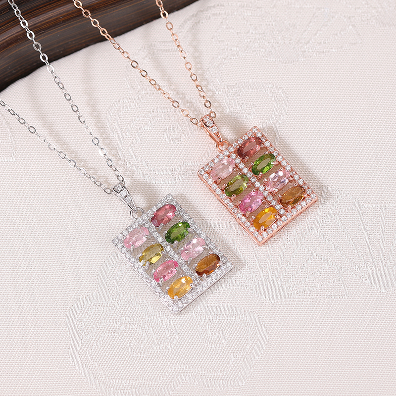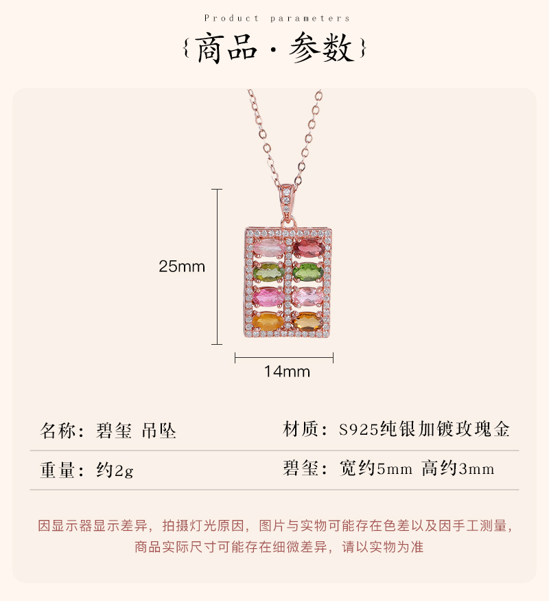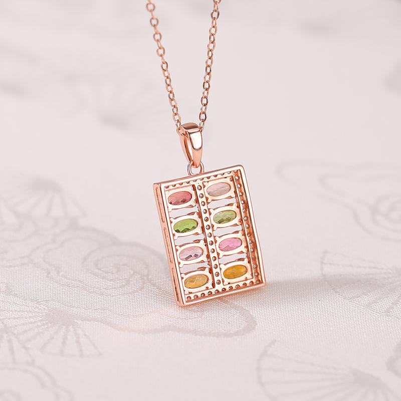 s925镀玫瑰金,白金时尚彩碧玺算盘镶锆切面吊坠