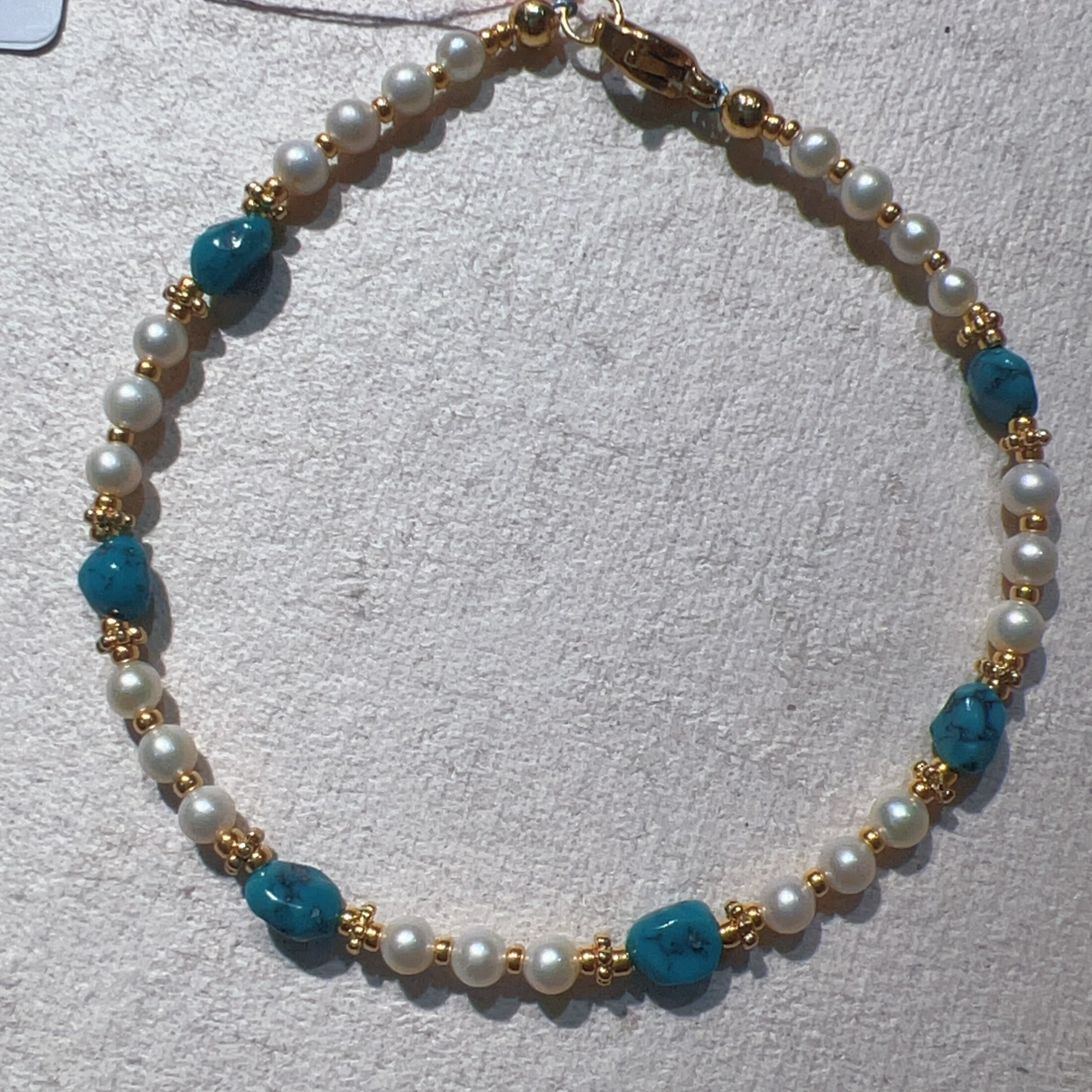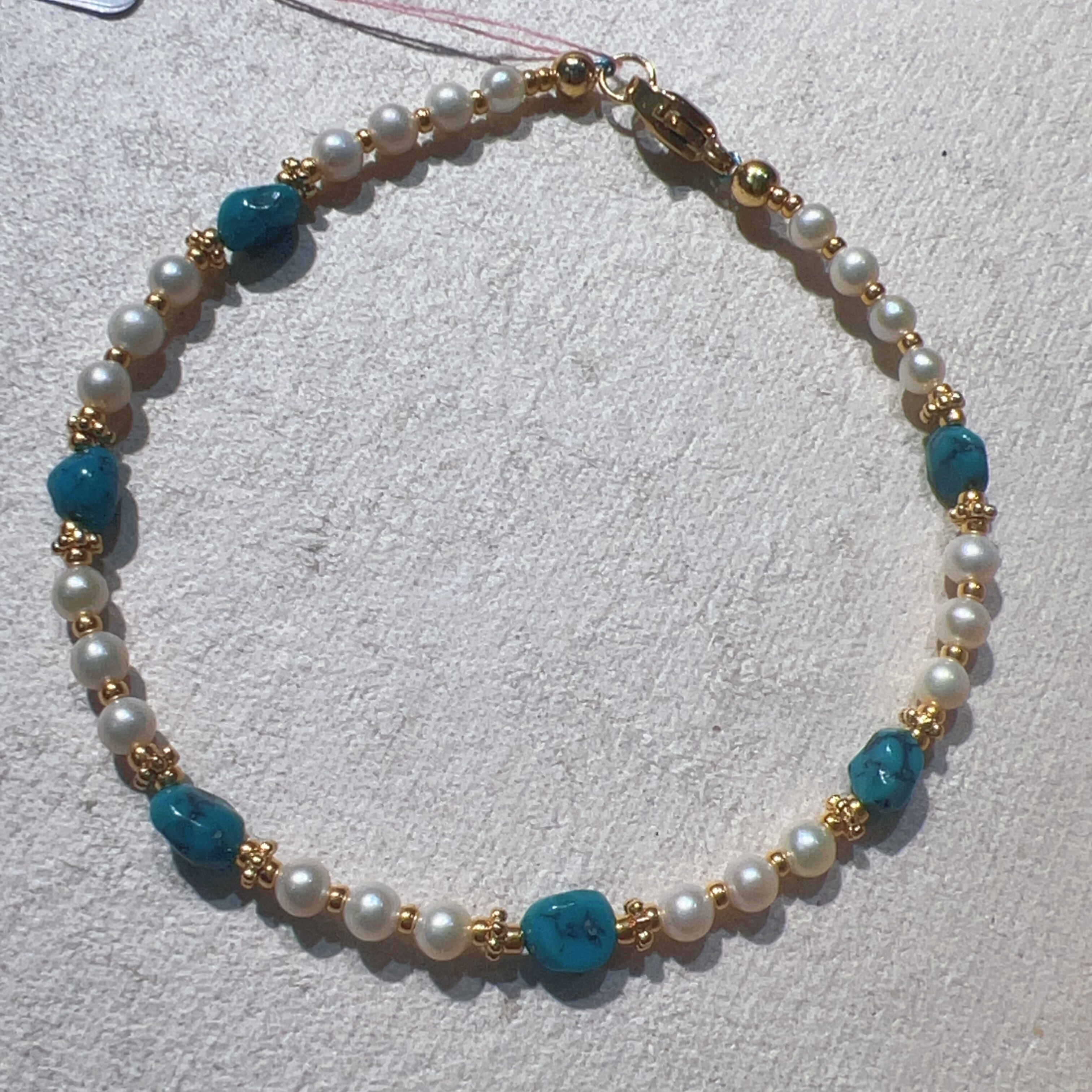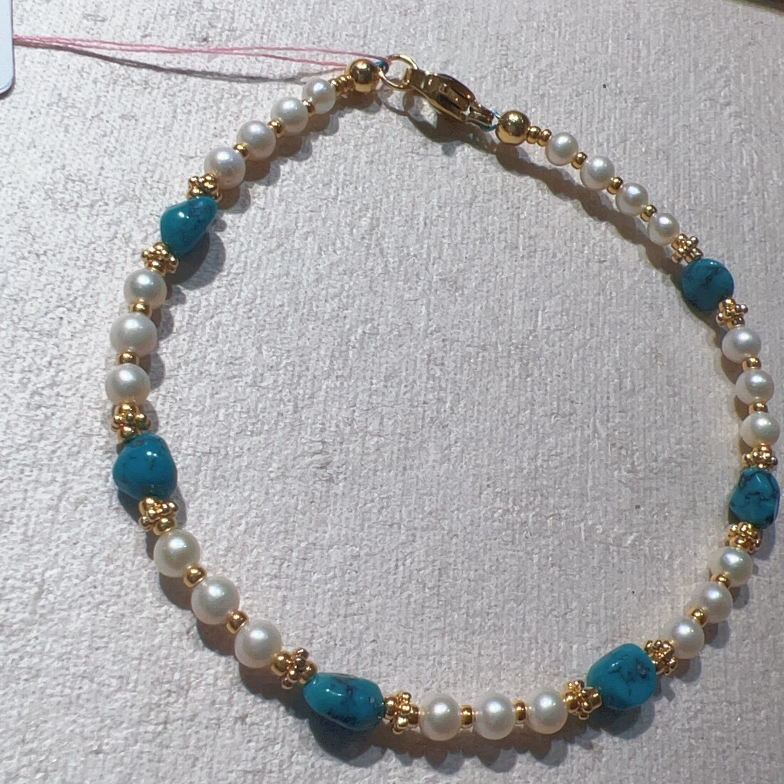 天然高瓷不规则绿松石手链淡水珍珠正圆小米珠女款原创设计轻奢金