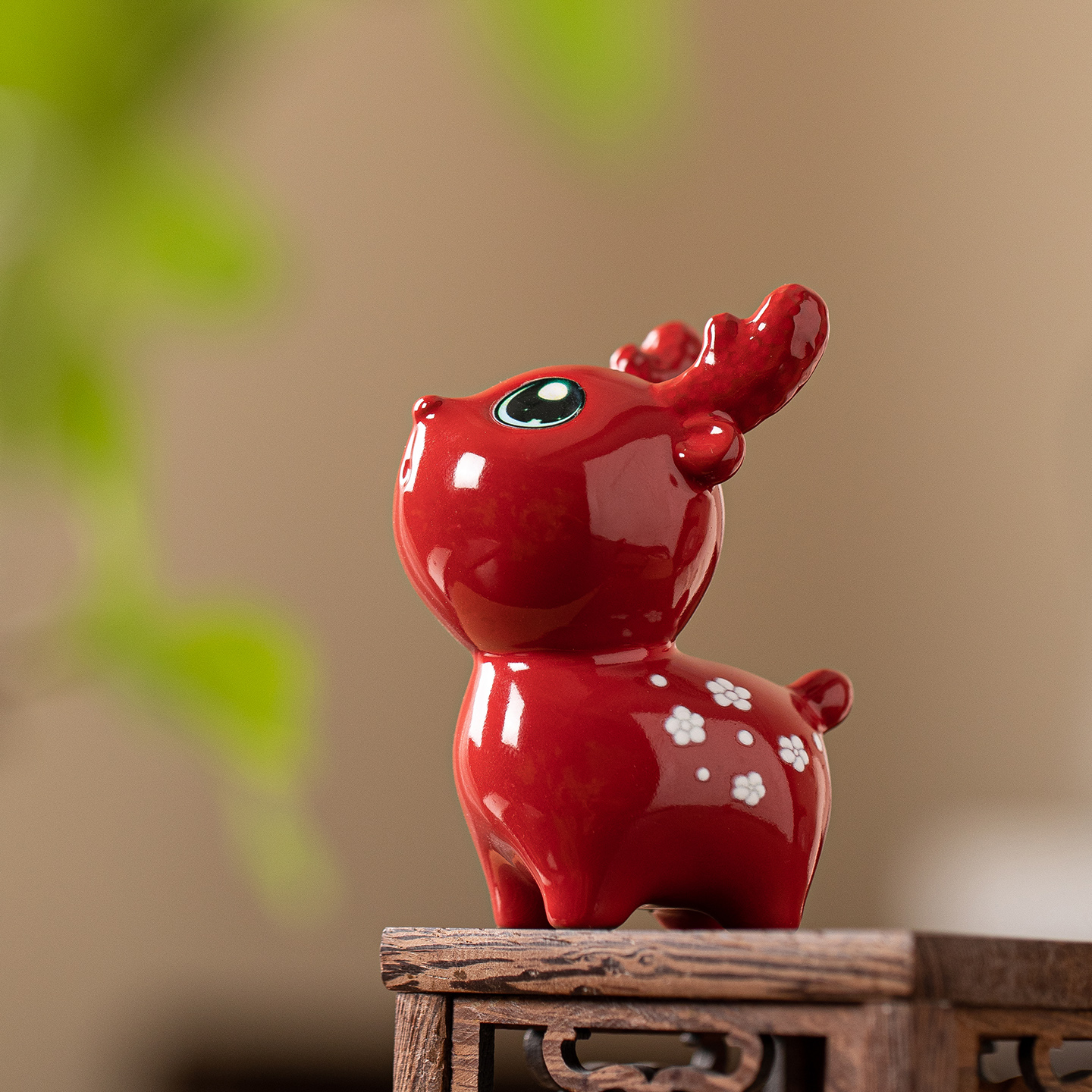 陶瓷可爱梅花鹿小摆件家居玄关办公室桌面红色小鹿禅意装饰工艺品