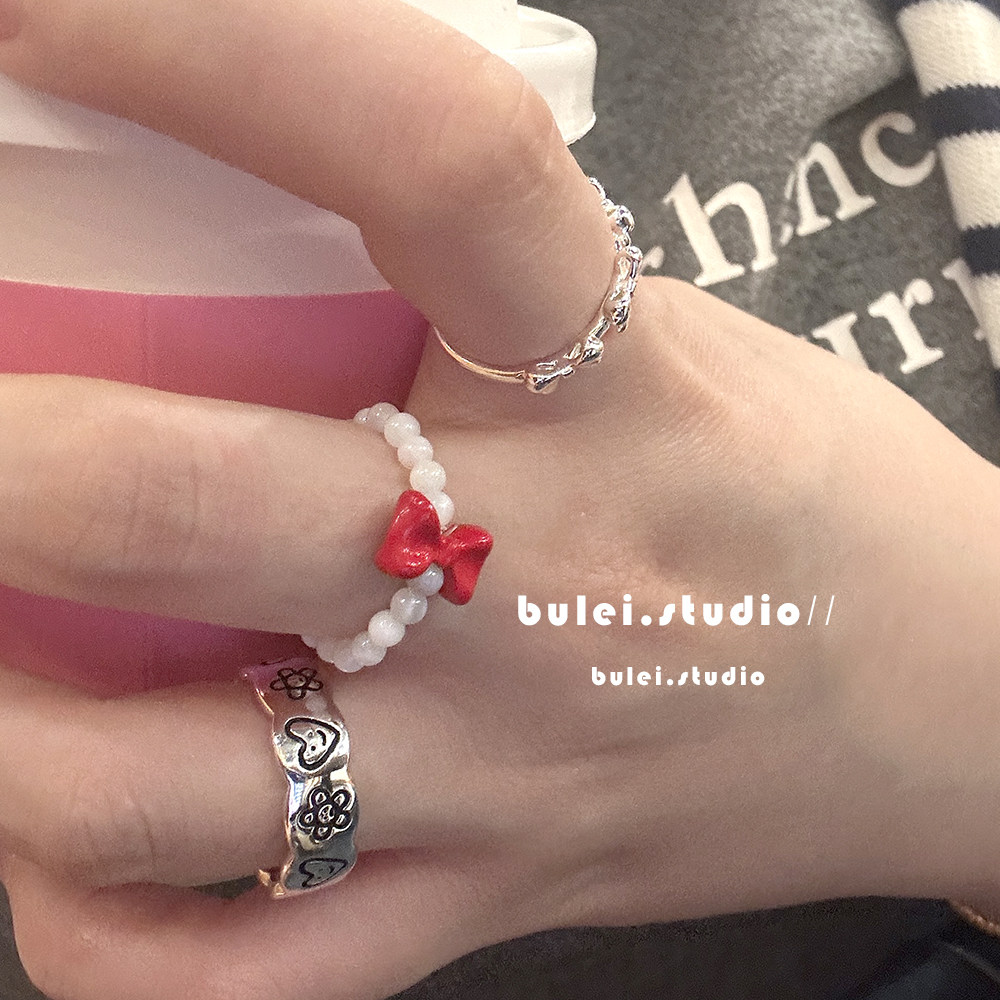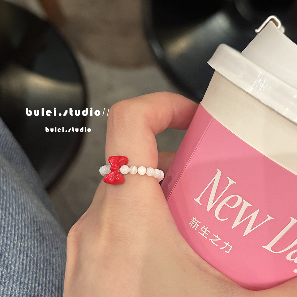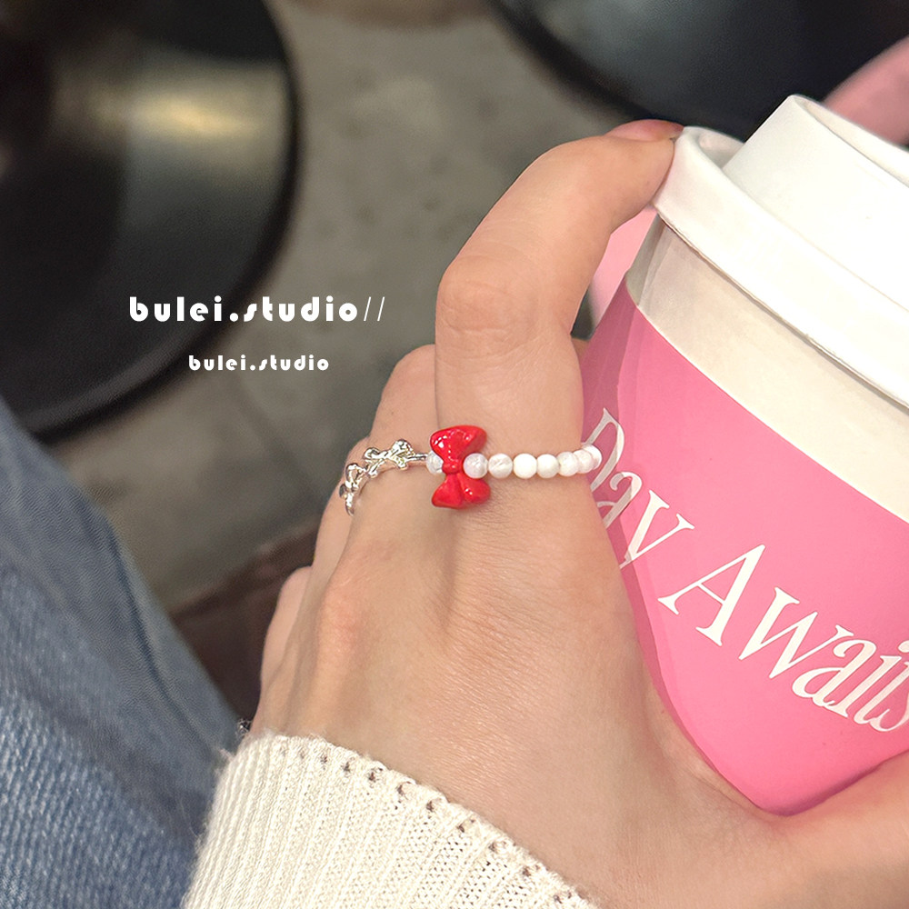 韩系手工串珠红色蝴蝶结戒指女2025多巴胺甜美少女心食指戒开口