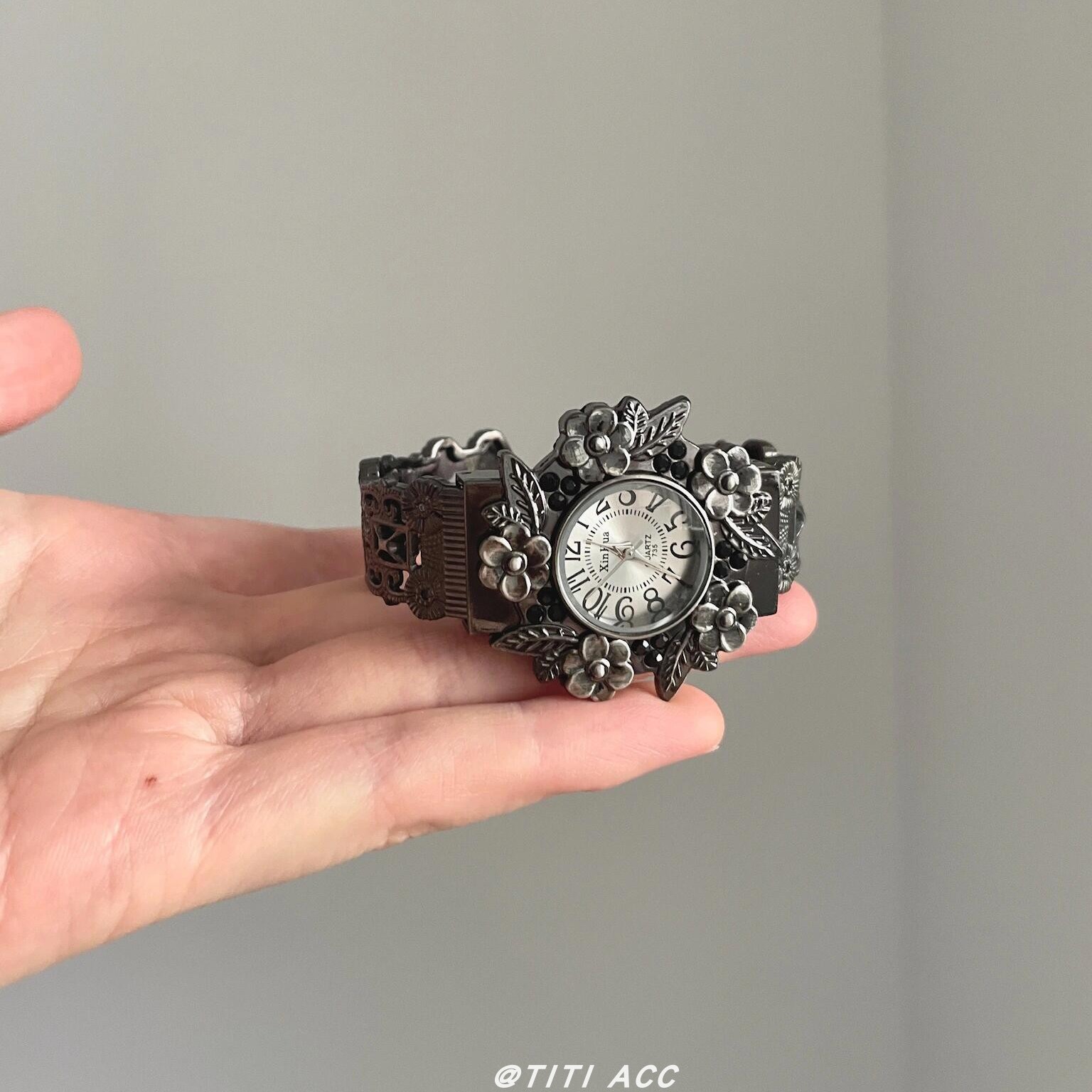 复古金属开口花朵手镯女朋克镂空手环手链小众设计甜酷风手表配饰