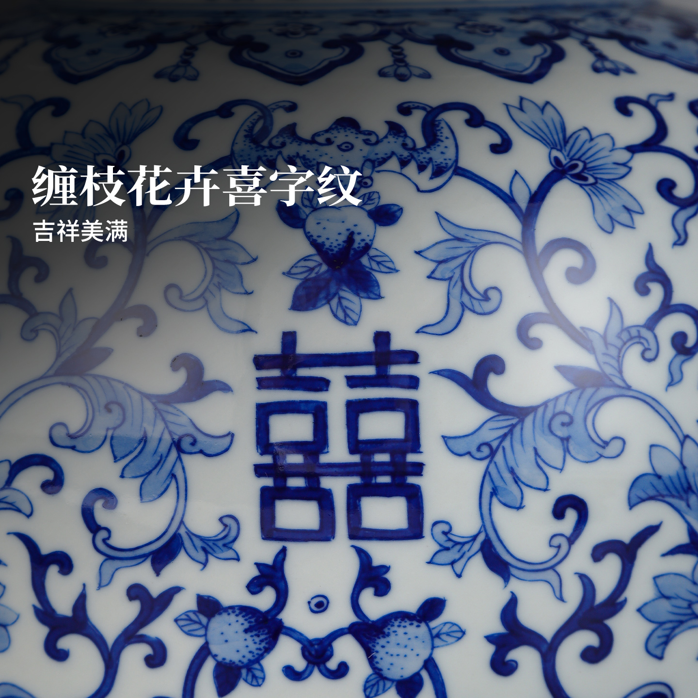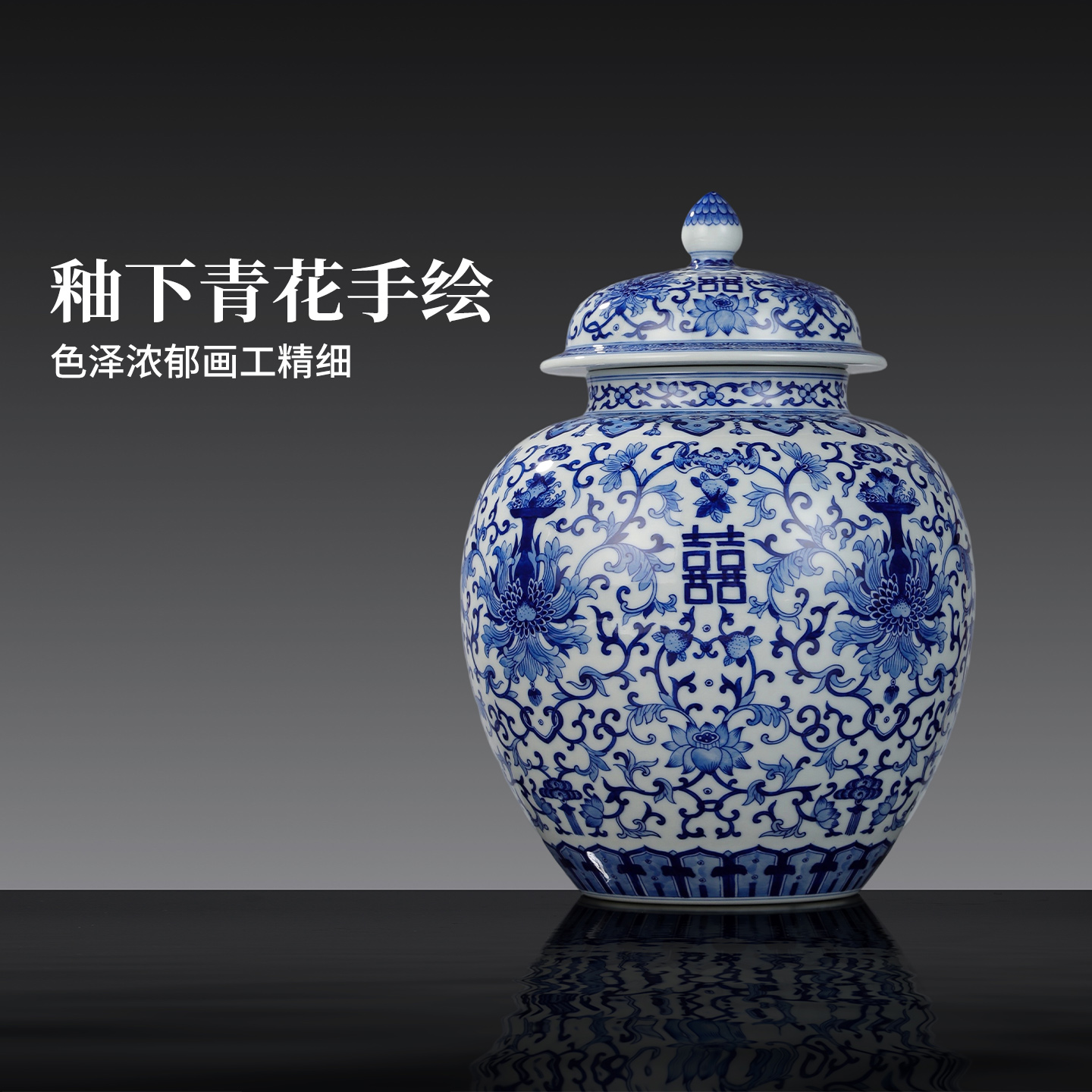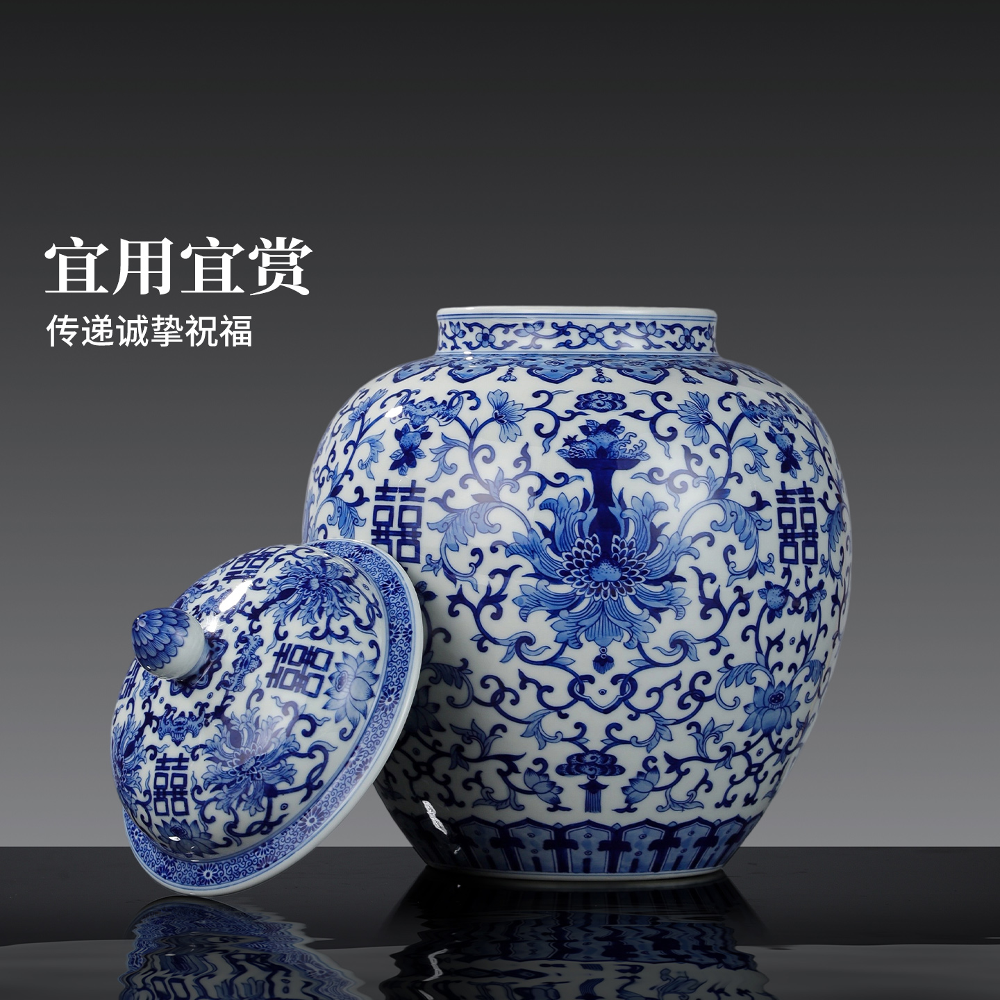 景德镇官方陶瓷手工青花缠枝花卉纹喜字罐中式仿古客厅摆件送礼