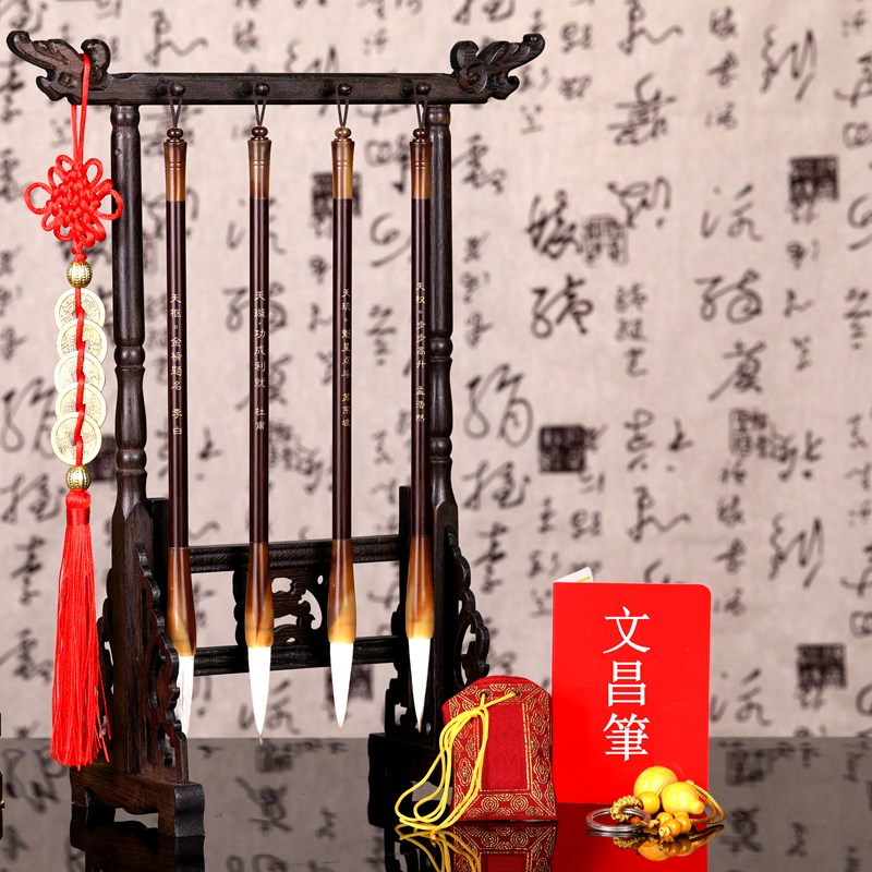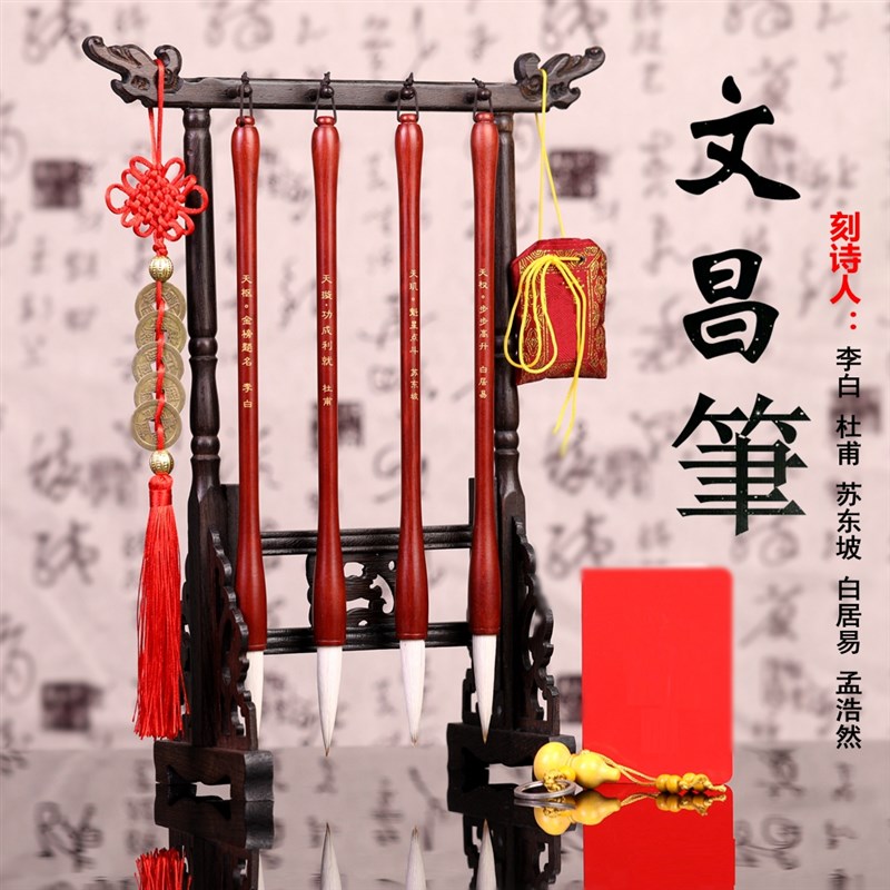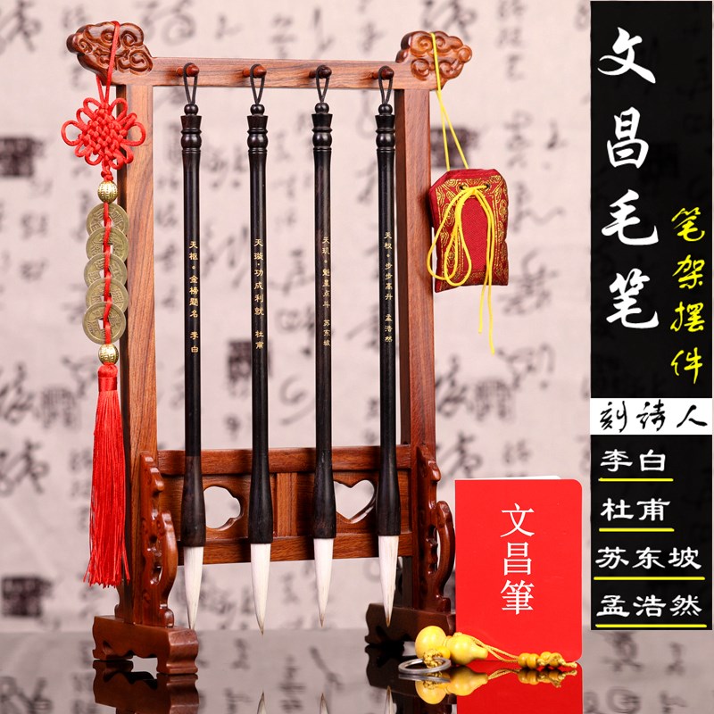 文昌笔学生书桌摆件实木笔架挂4支毛笔刻诗人名字局文房四宝新品