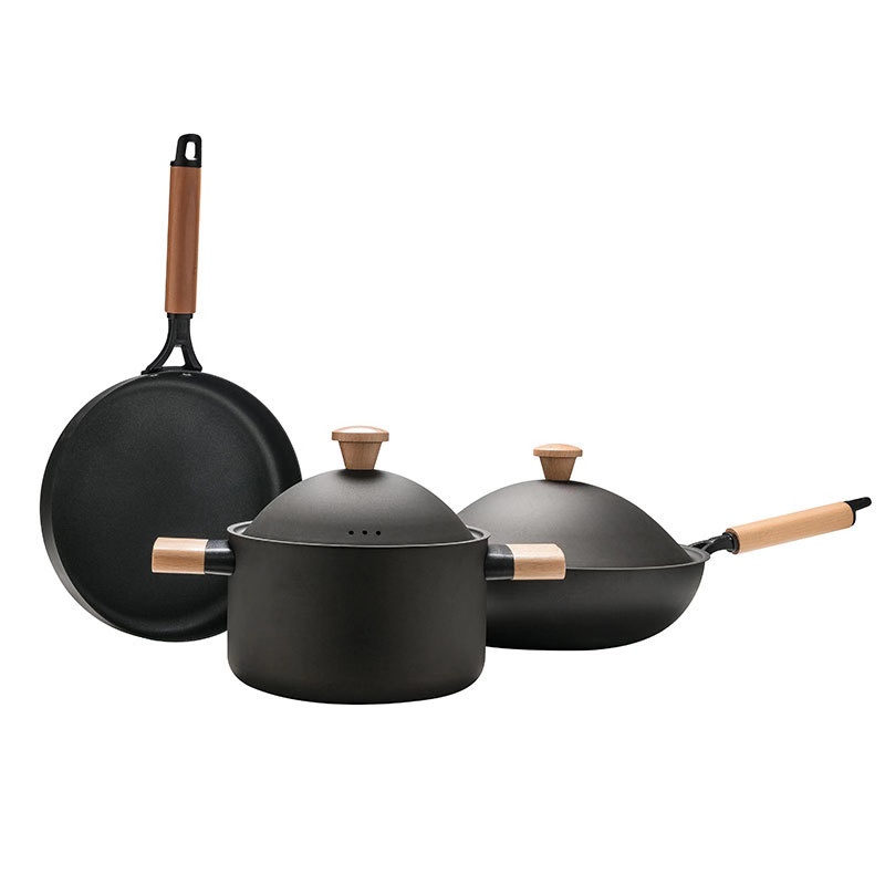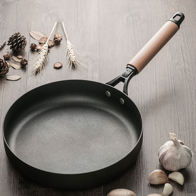 样板间定制家居新中式厨房黑色原木手柄精铁炒锅平底汤锅设计摆件