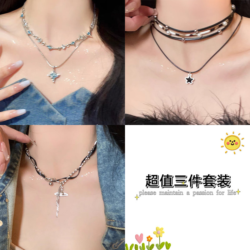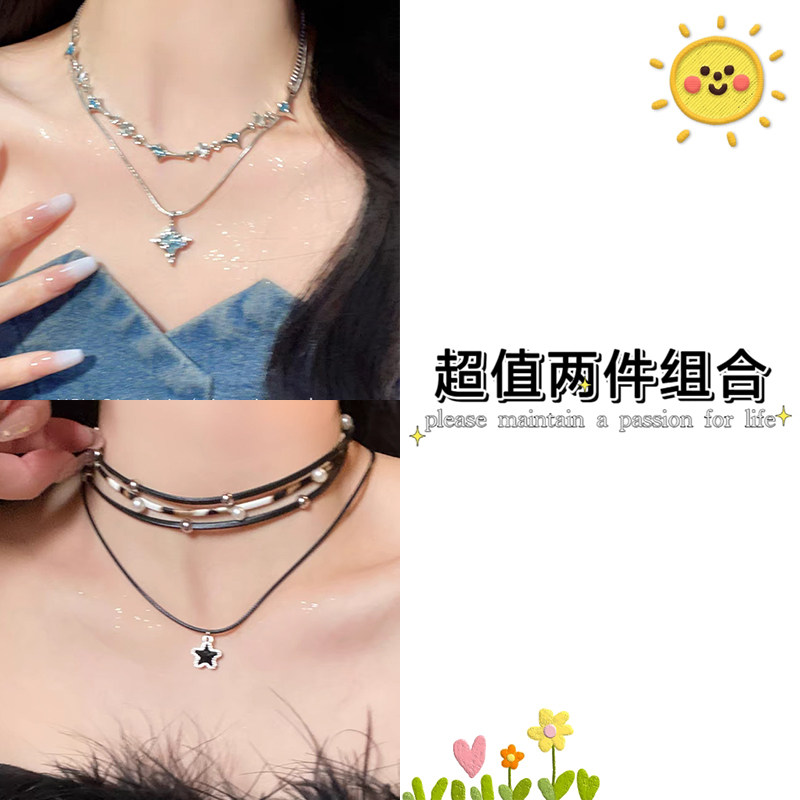 蓝色四芒星锆石双层项链女夏季ins小众设计感配饰时尚气质锁骨链