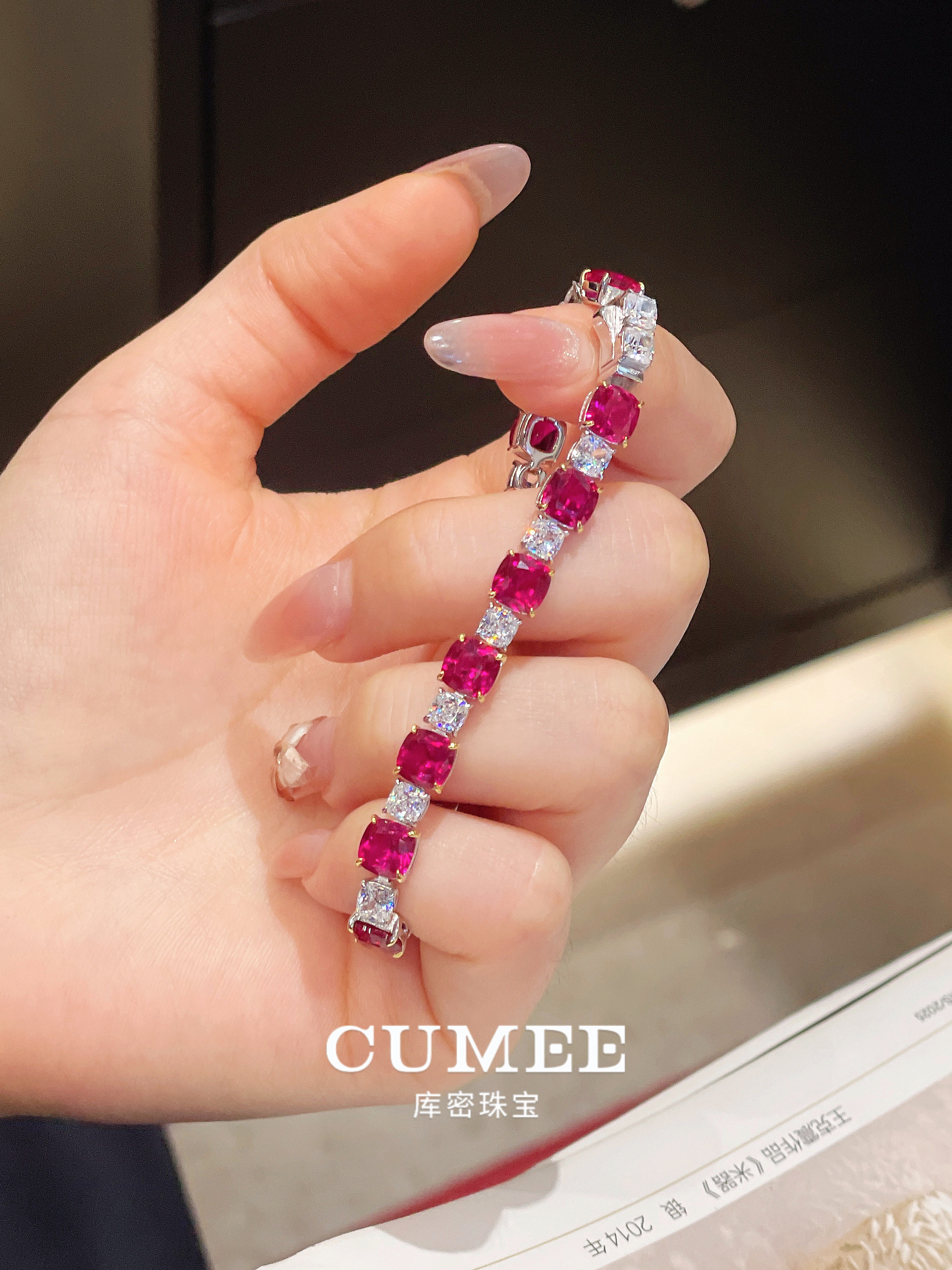 CUMEE 满镶 经典晚宴首饰套装 培育合成红宝石手链项链.银镀金