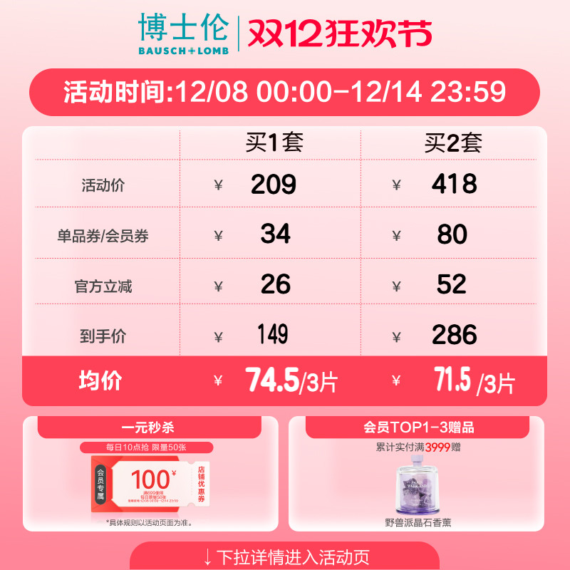 [买4赠4]博士伦纯视2代硅水凝胶月抛隐形近视眼镜官方旗舰店正品