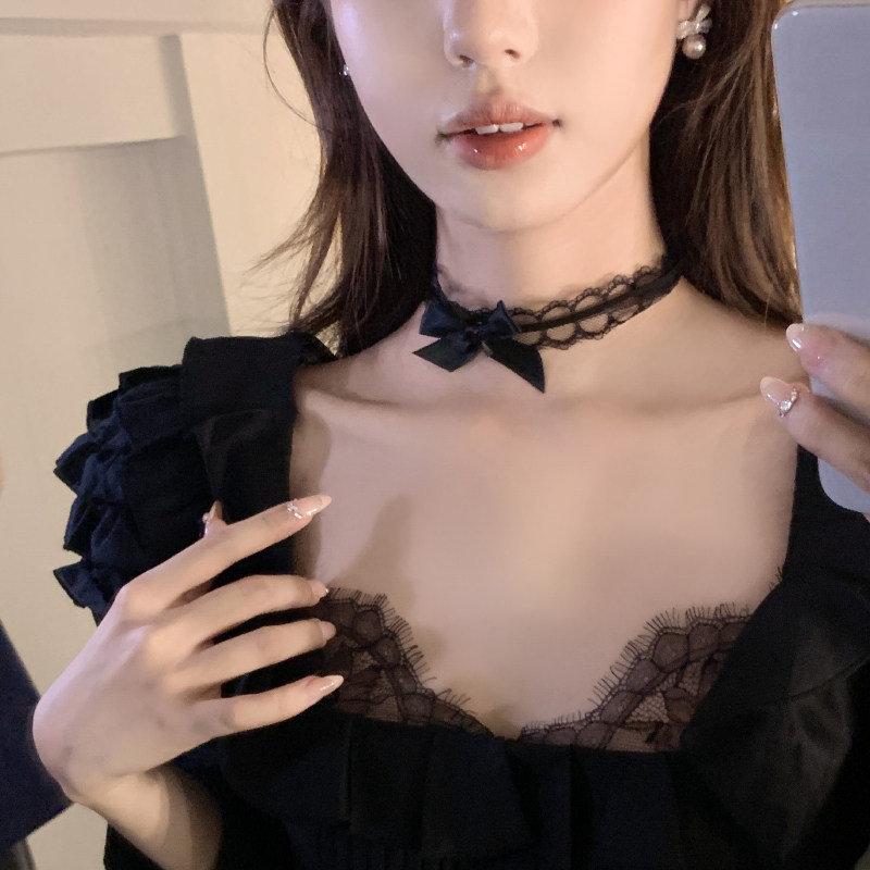 【蜜桃茶】纯欲风黑色蝴蝶结蕾丝choker女颈带项圈脖子配饰锁骨链