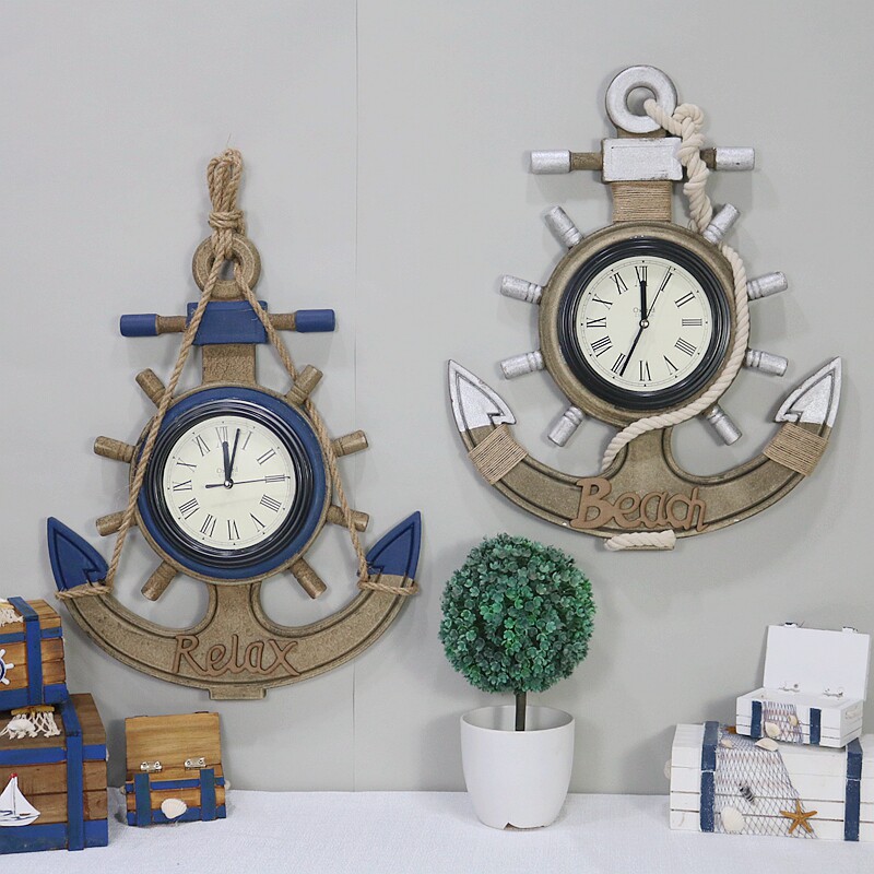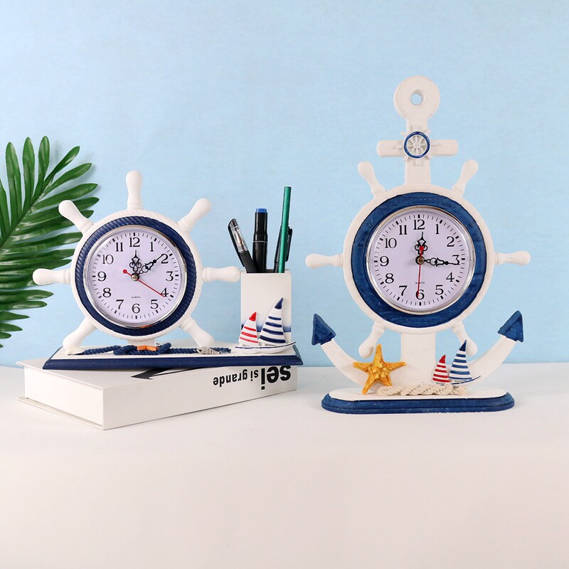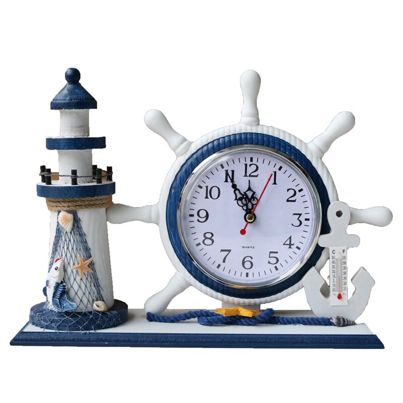 地中海木质静音钟表客厅摆件航海舵手灯塔座钟儿童房独特桌面台钟