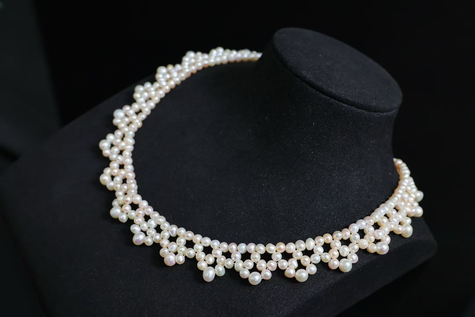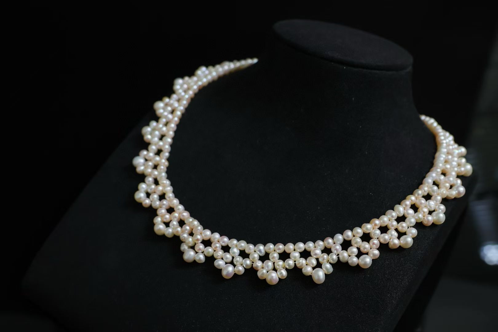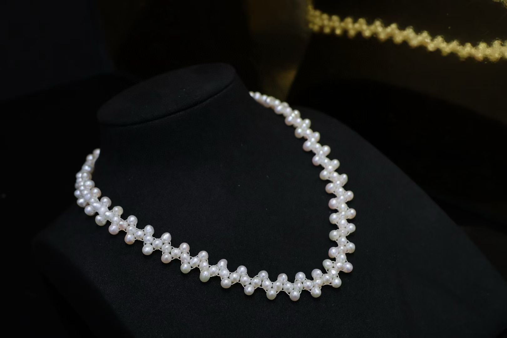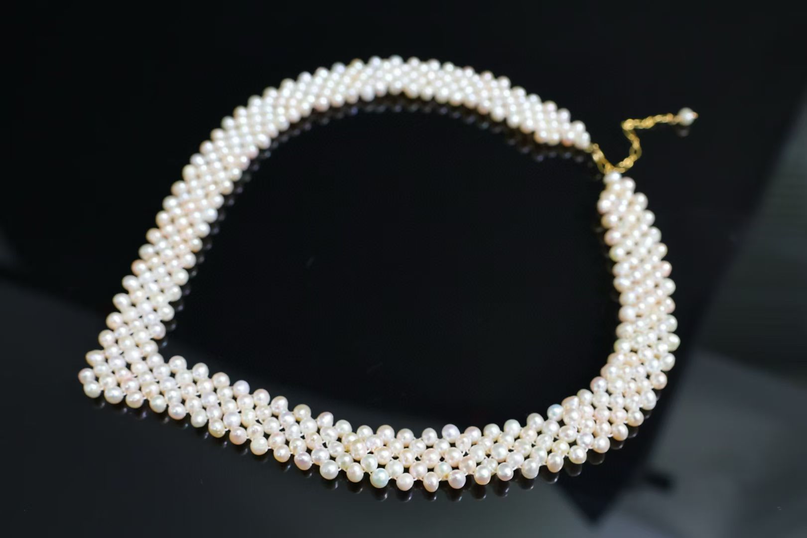 天然淡珍珠项链3-4mm近圆微瑕加美国进口14k包金手工编织珍珠简约