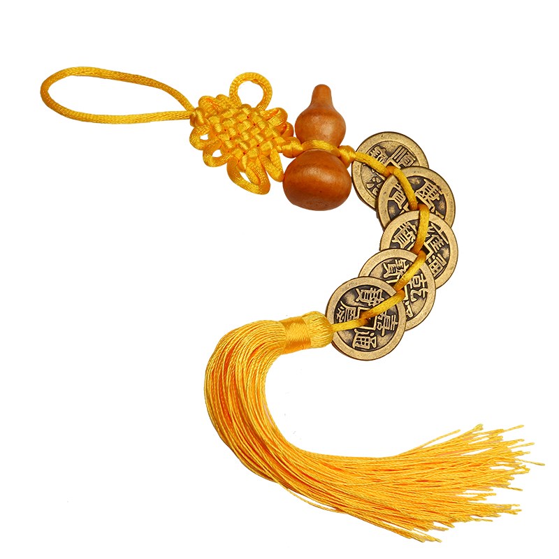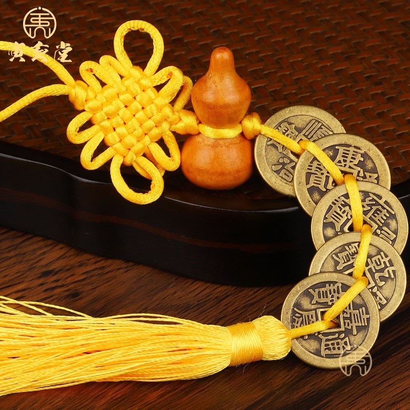 黄铜加厚黄中国结桃木葫芦五帝钱挂件黄绳三六七八九十帝钱满文背