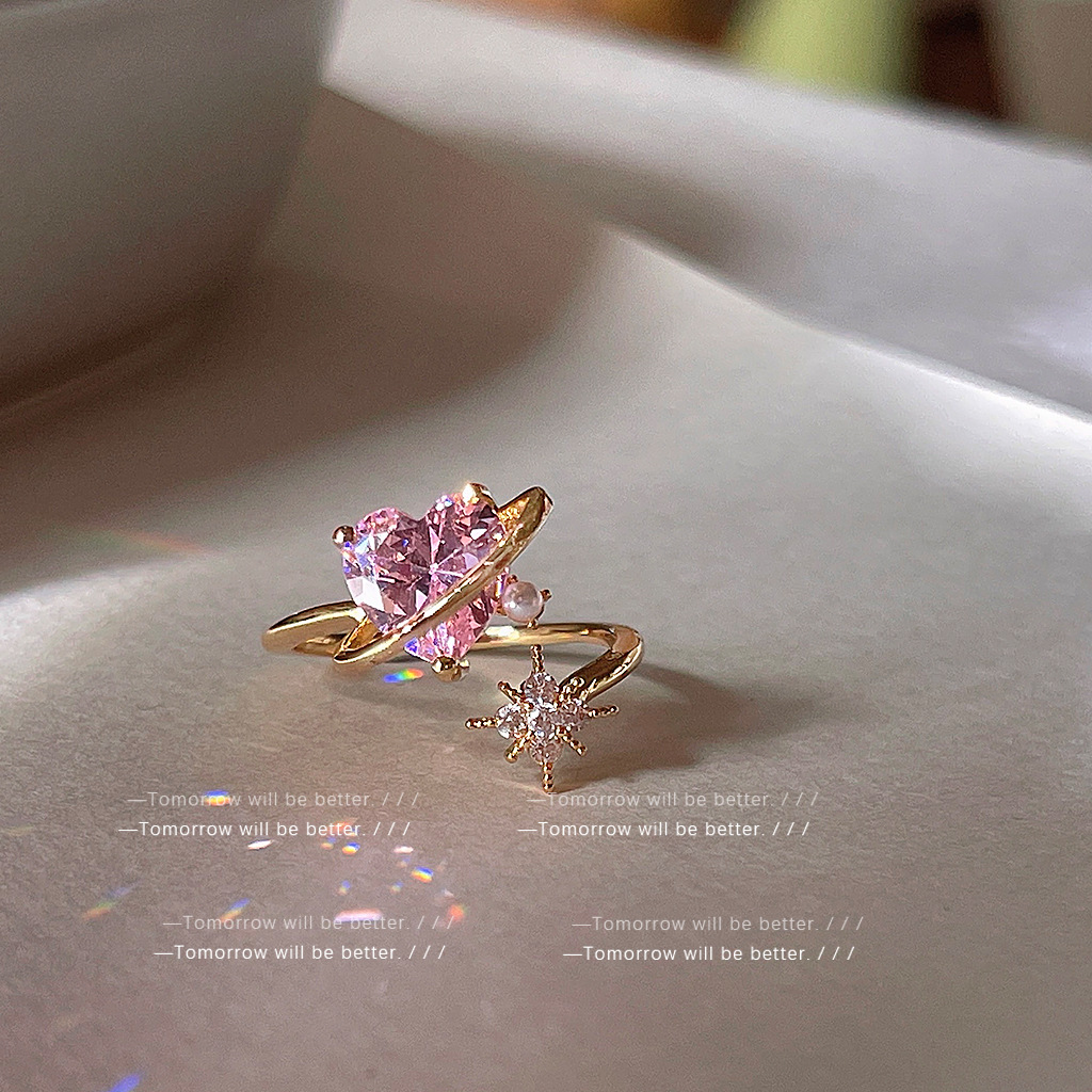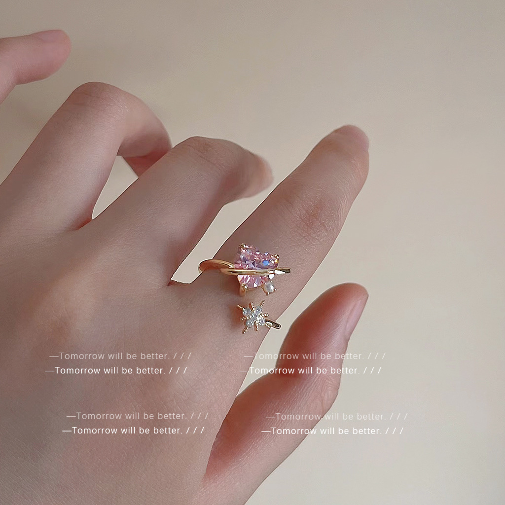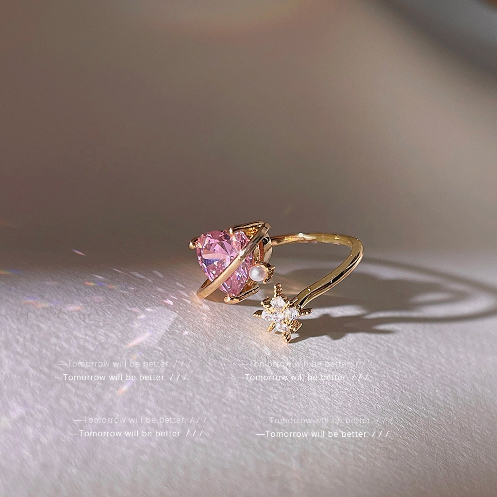 仙女必入!!粉色爱心锆石戒指女轻奢ins风个性食指戒开口可调节
