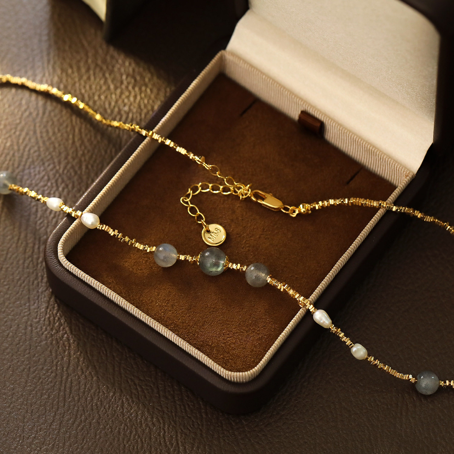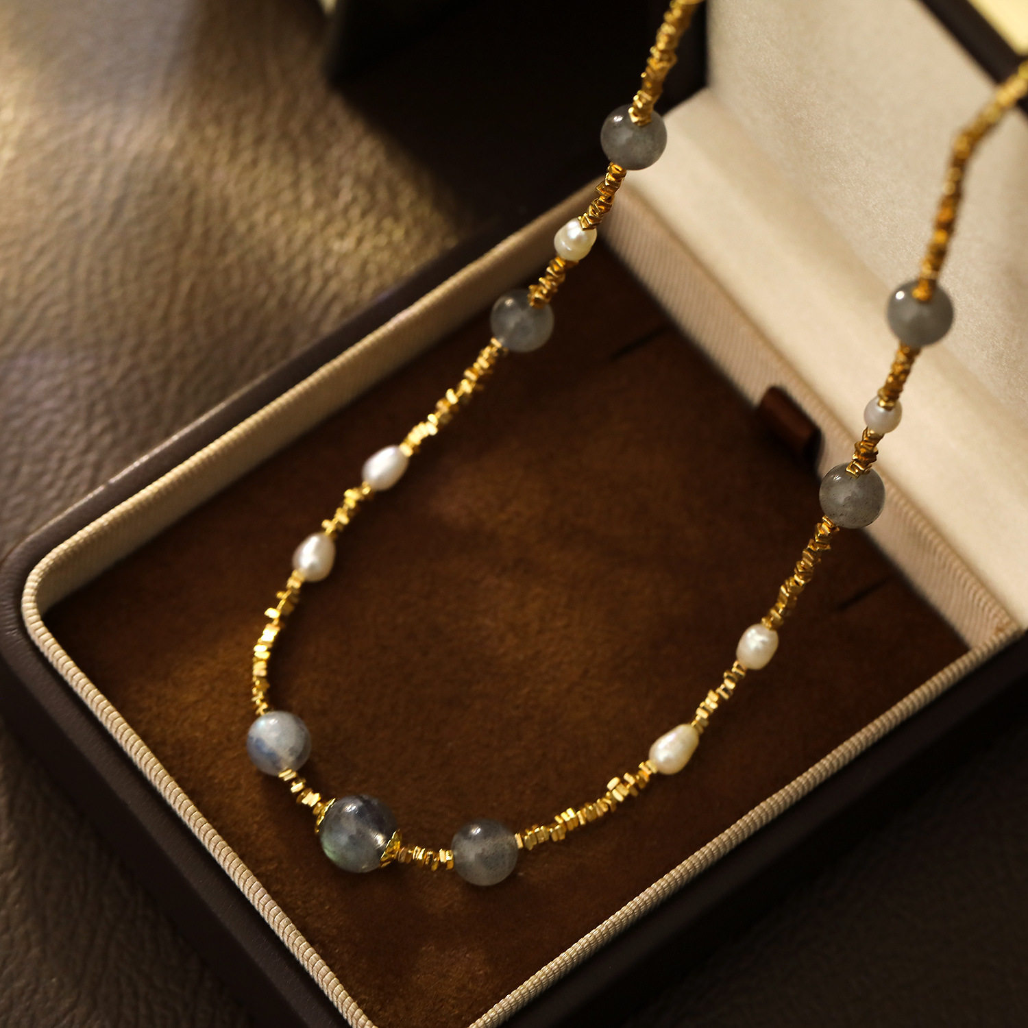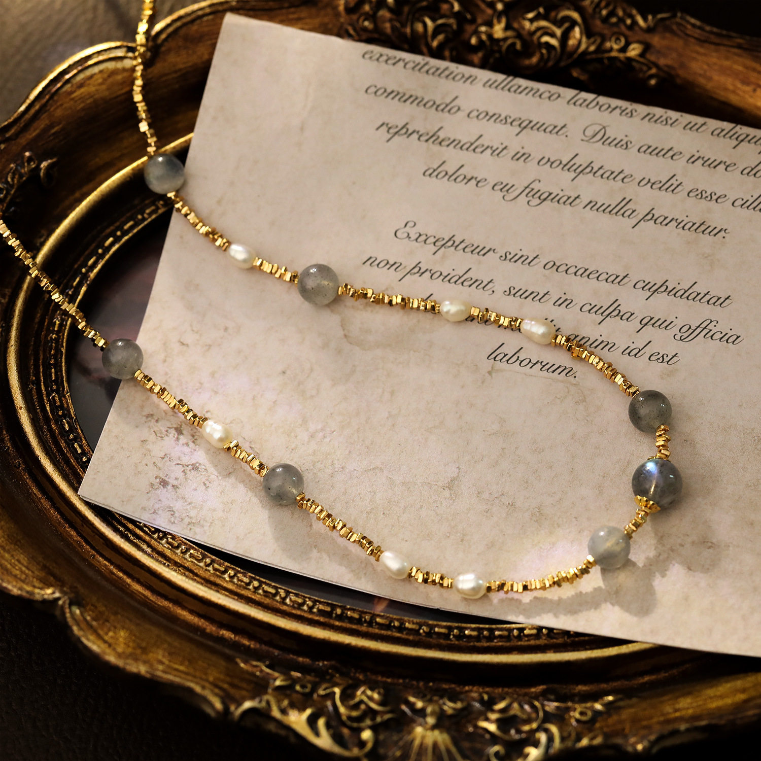 原创设计复古清冷灰色月光石珍珠项链小碎金古风轻奢锁骨链颈链