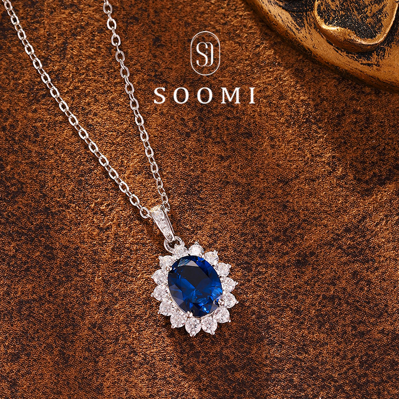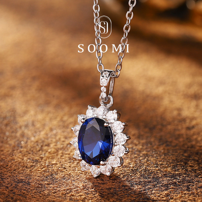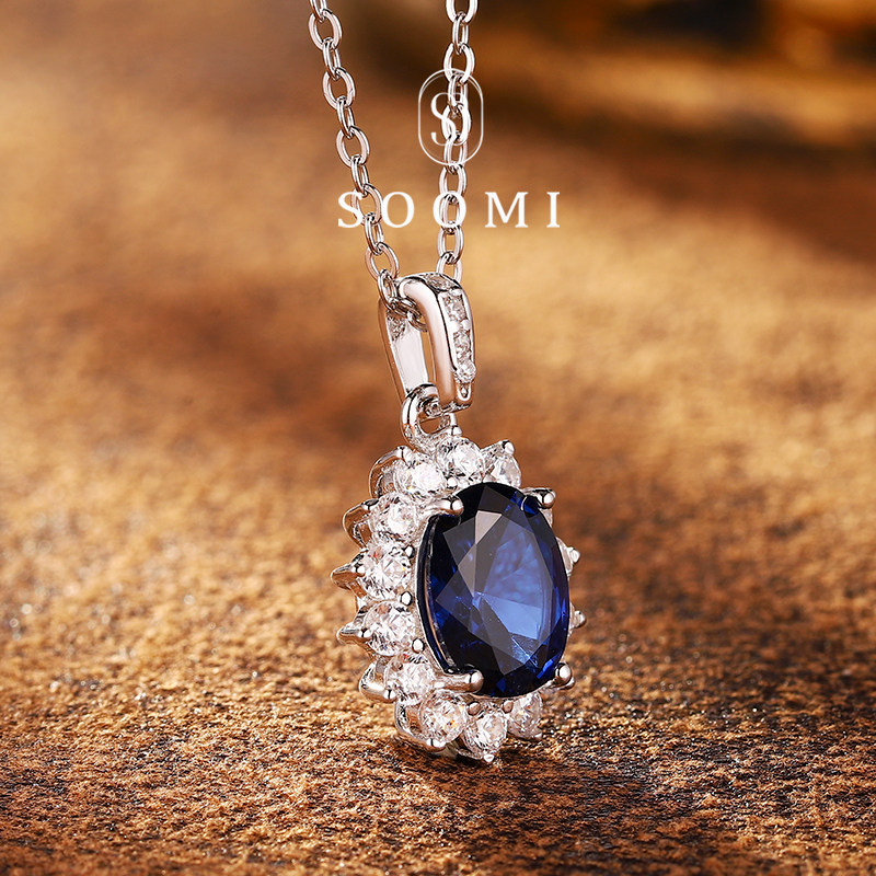 [SOOMI太阳花]925银培育皇家蓝宝石项链经典日常围镶钻石吊坠设计