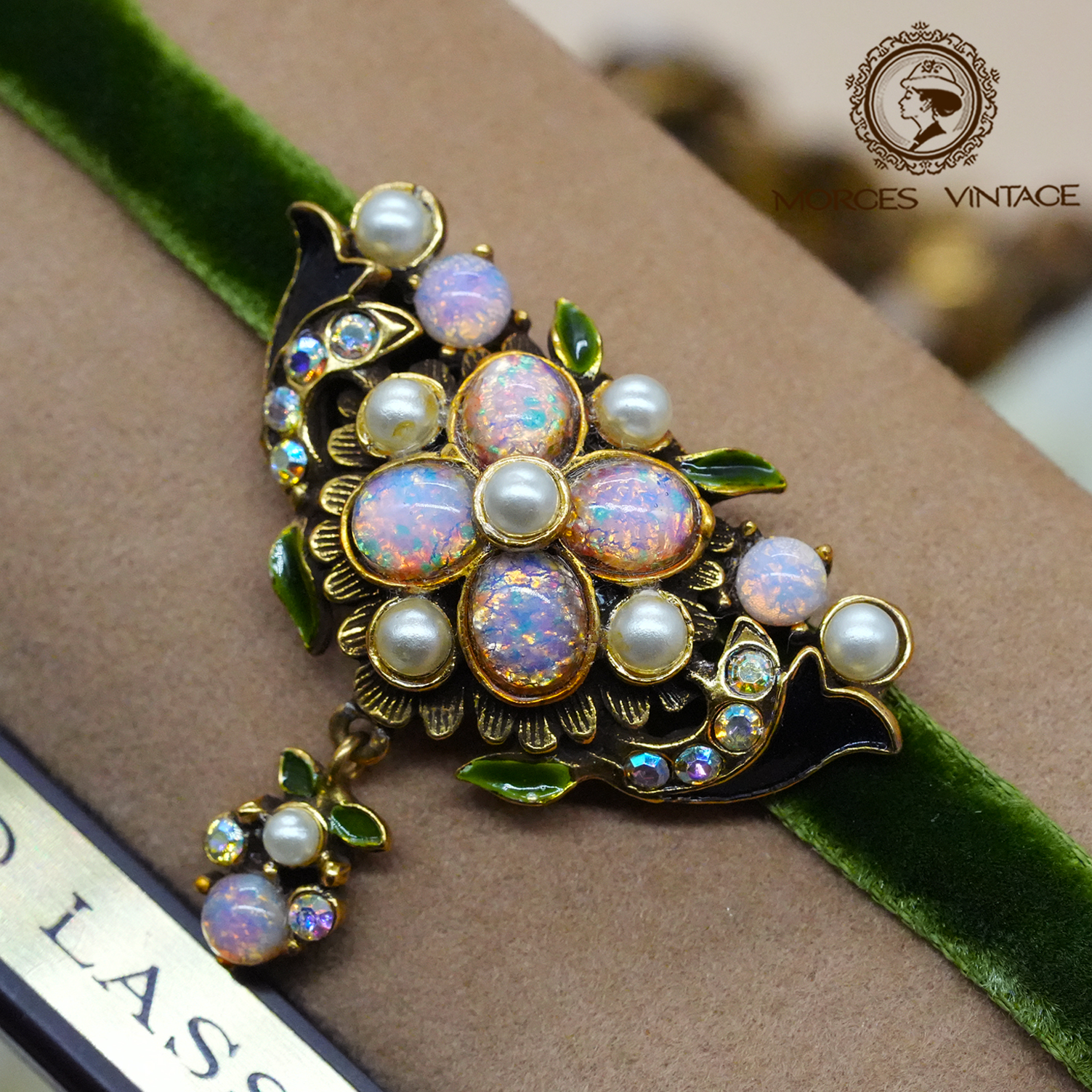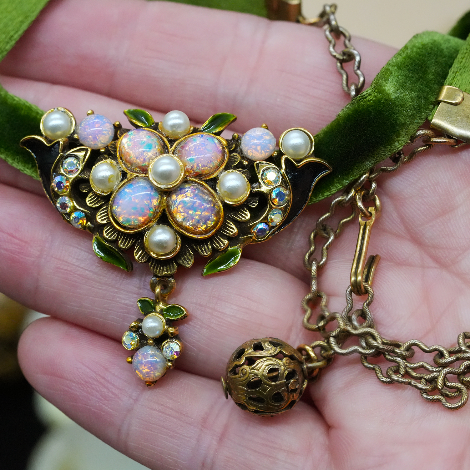 Vintage中古首饰60年代仿欧泊龙吸琉璃绿色绒布CHOKER项链