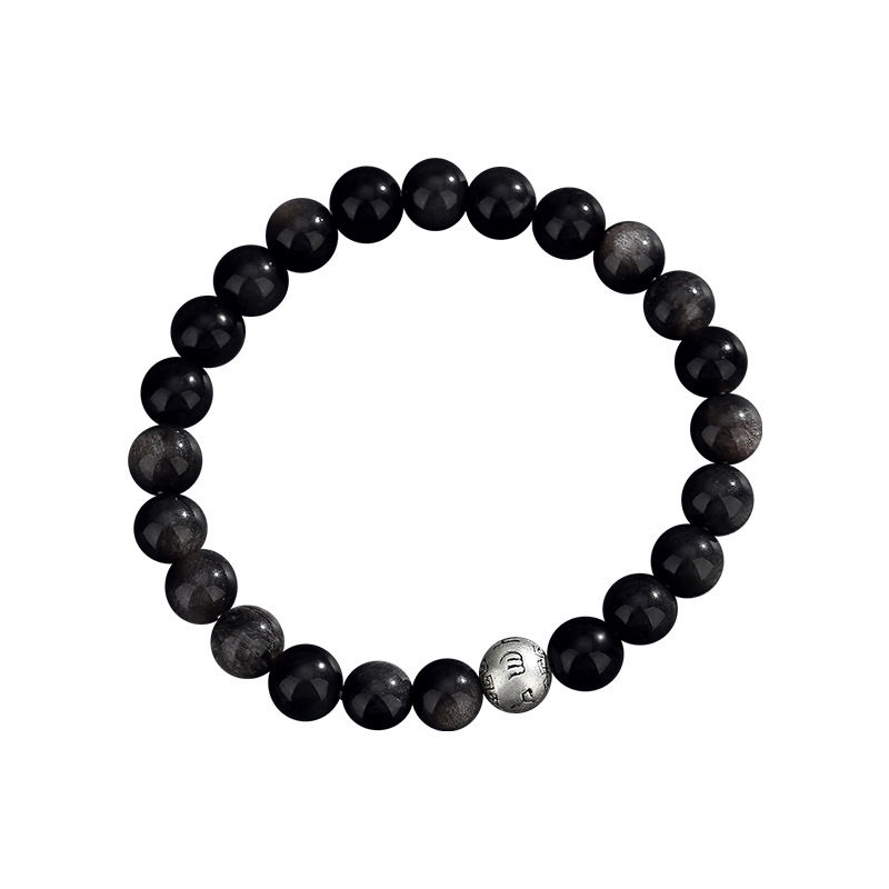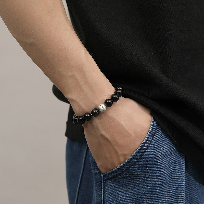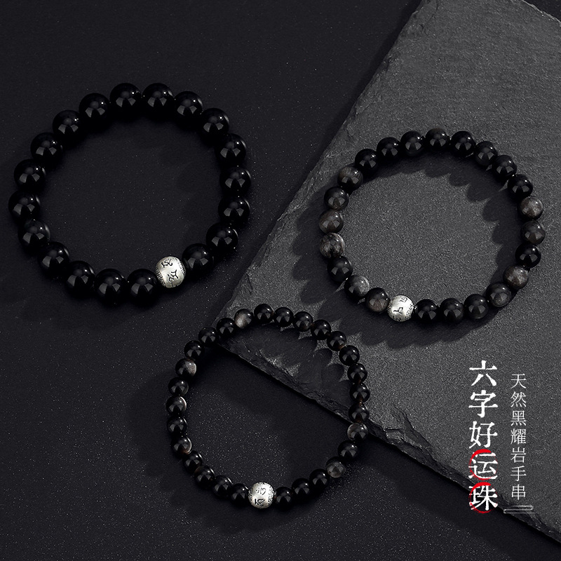 天然黑曜石六字箴言手串男纯银999复古潮流高级感转运珠手饰男士