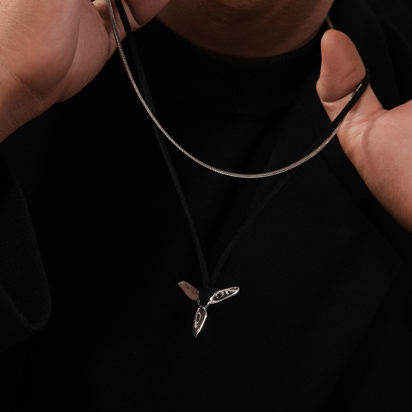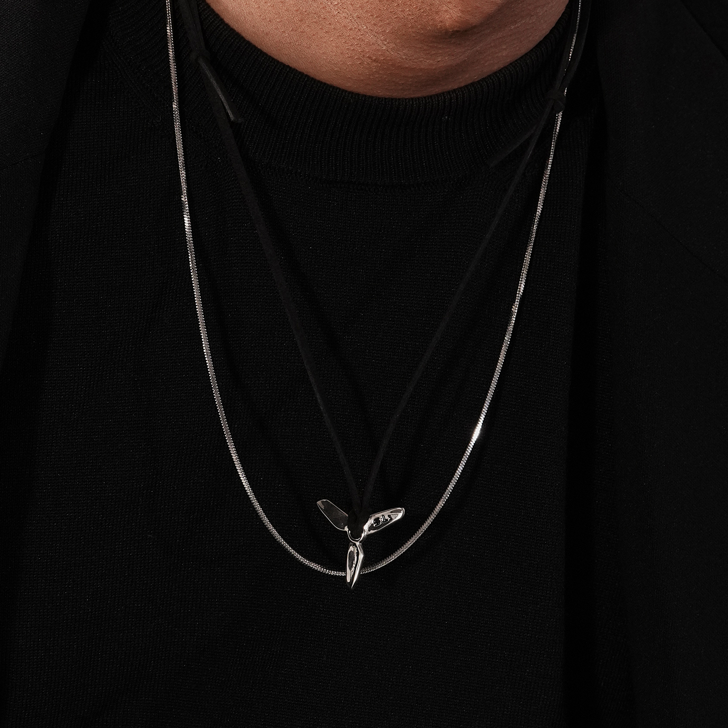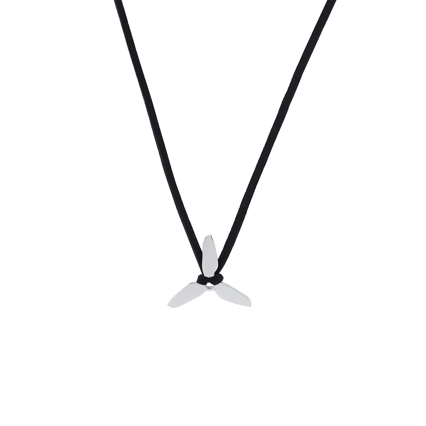 SAZ 极简风百搭街头黑色皮绳银色风扇吊坠长款毛衣链男女小众项链