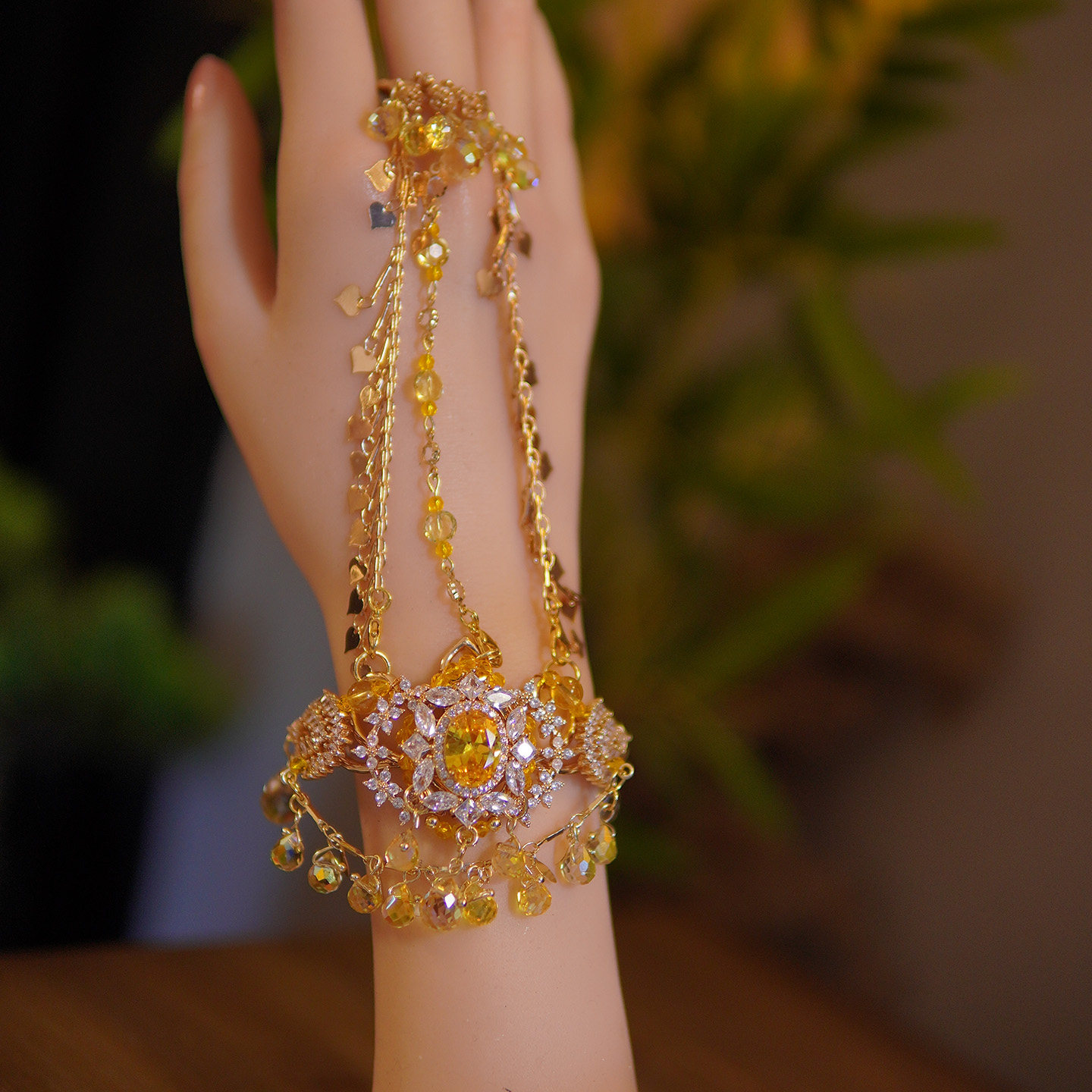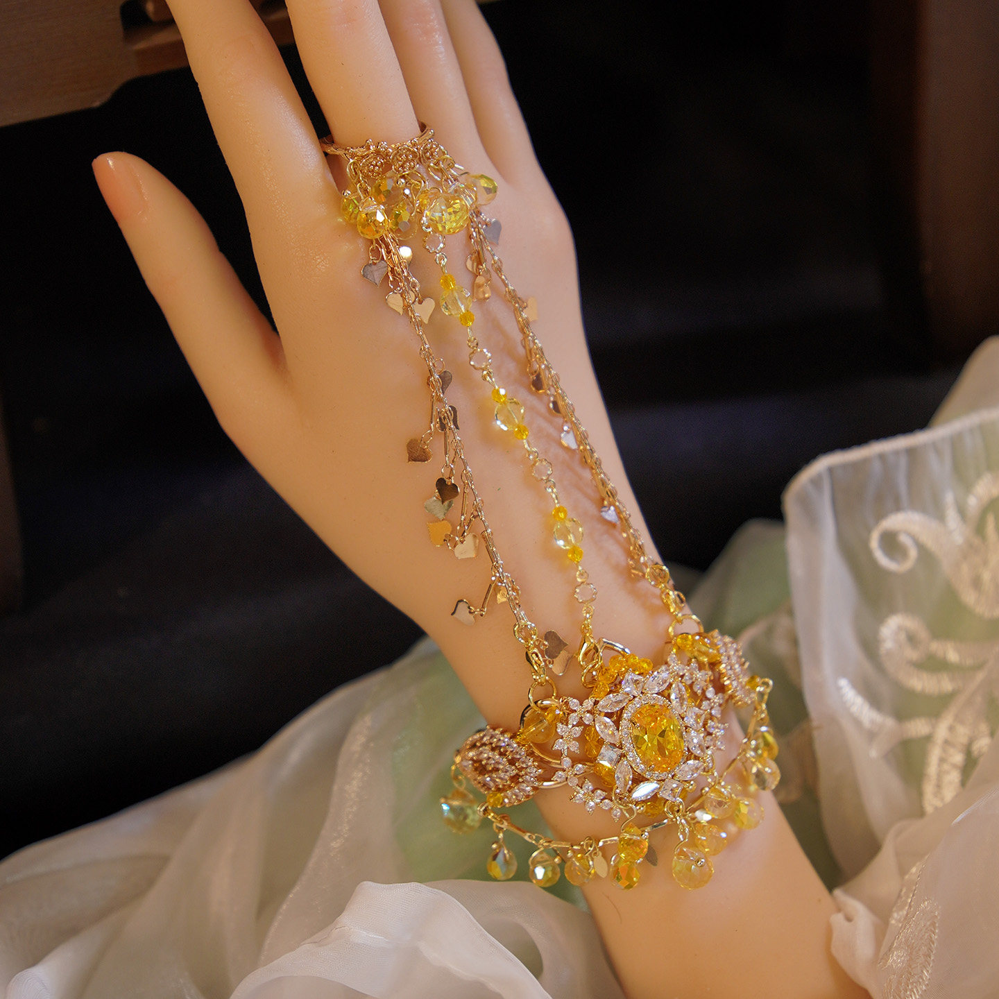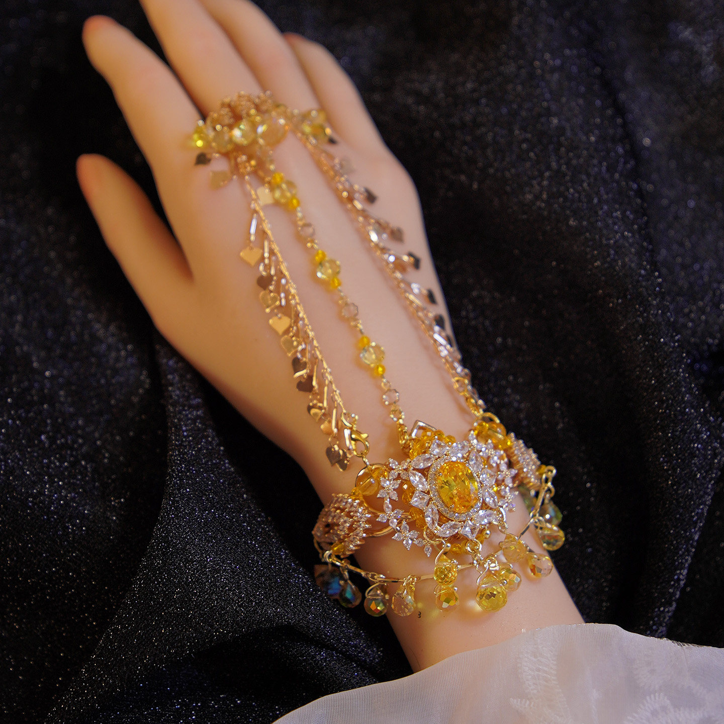 芳菲雪原创手工汉服异域风古风黄色手镯戒指一体演出首饰月下金秋