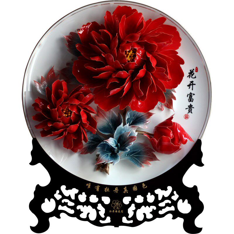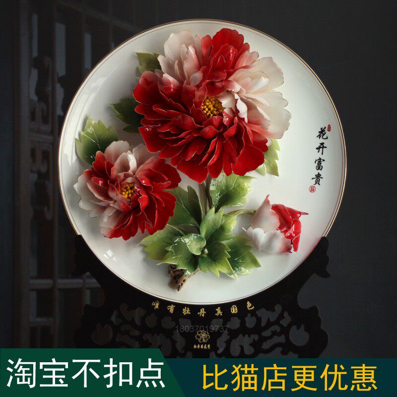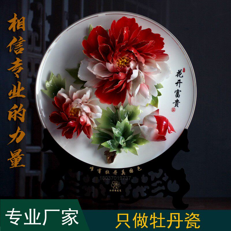 洛阳牡丹瓷盘摆件乔迁商务工艺礼品挂盘透光骨瓷描金边牡丹花瓷盘