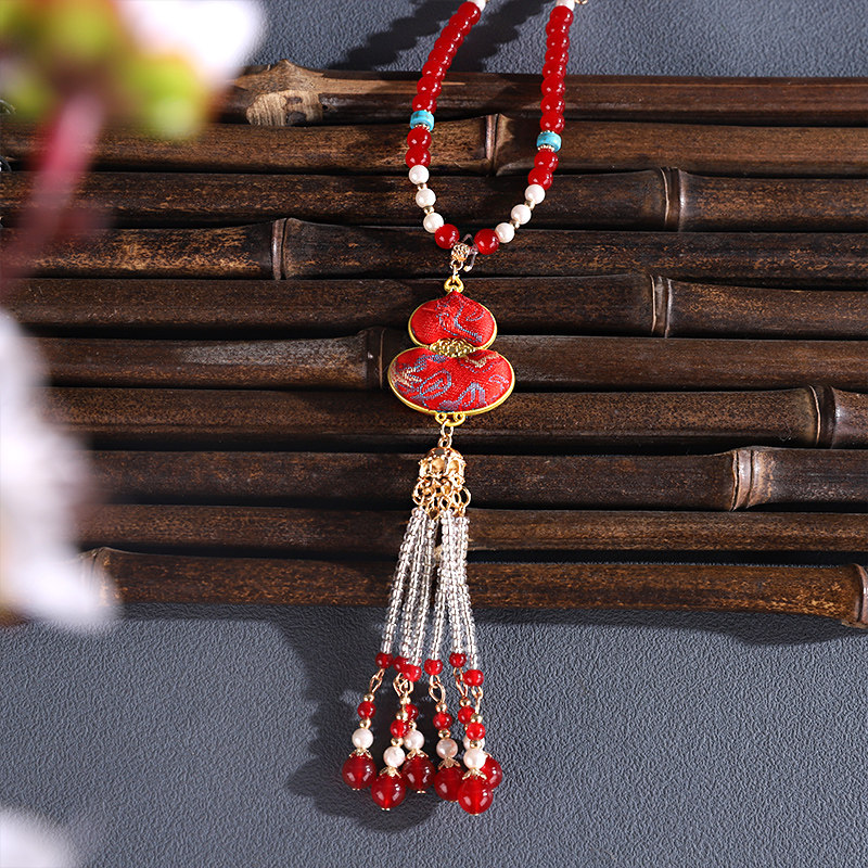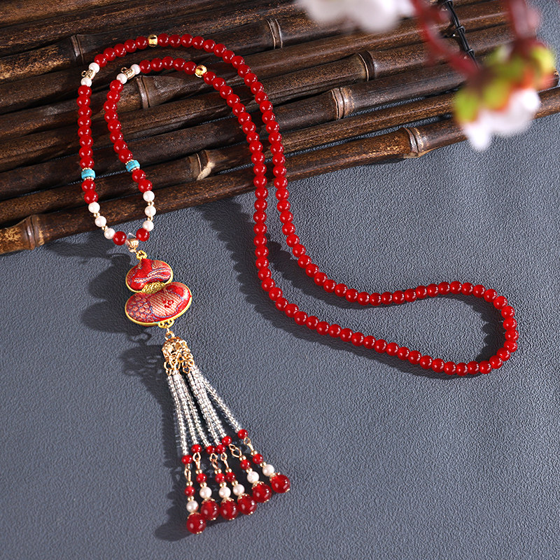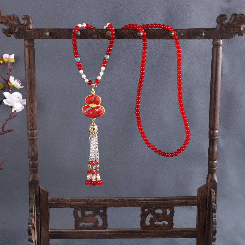古风红色珍珠红葫芦璎珞串珠流苏毛衣链女新中式汉服配饰长项链