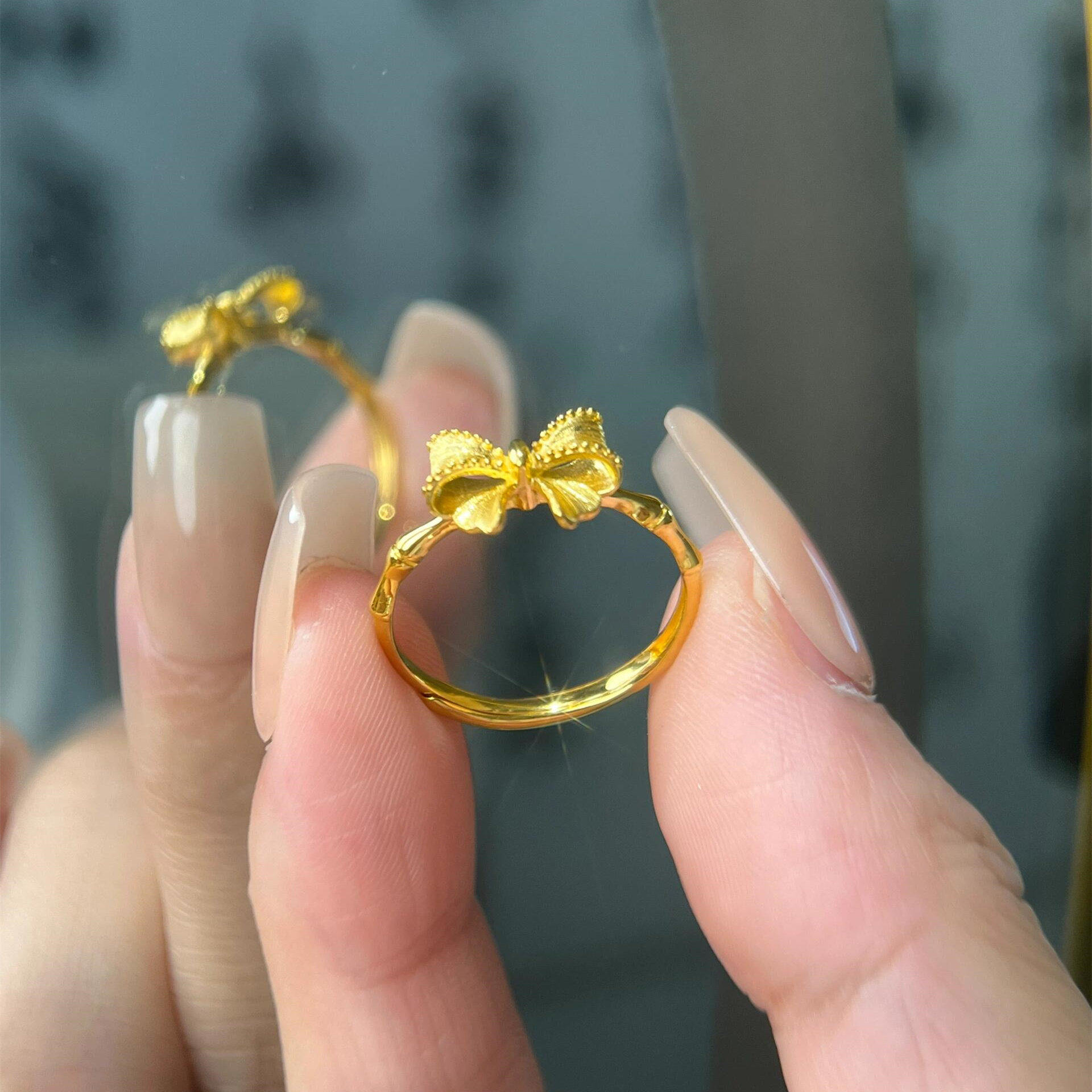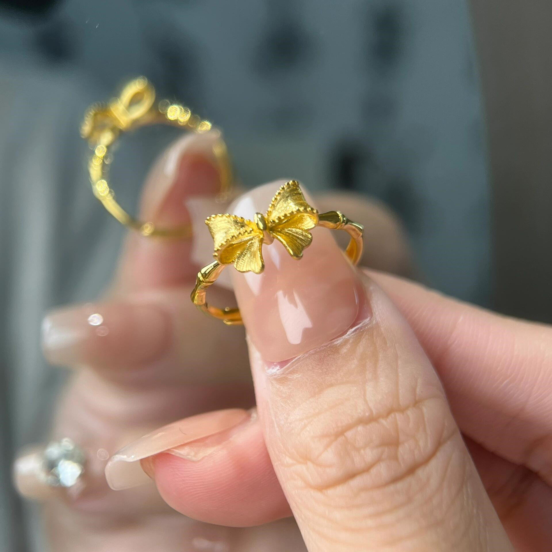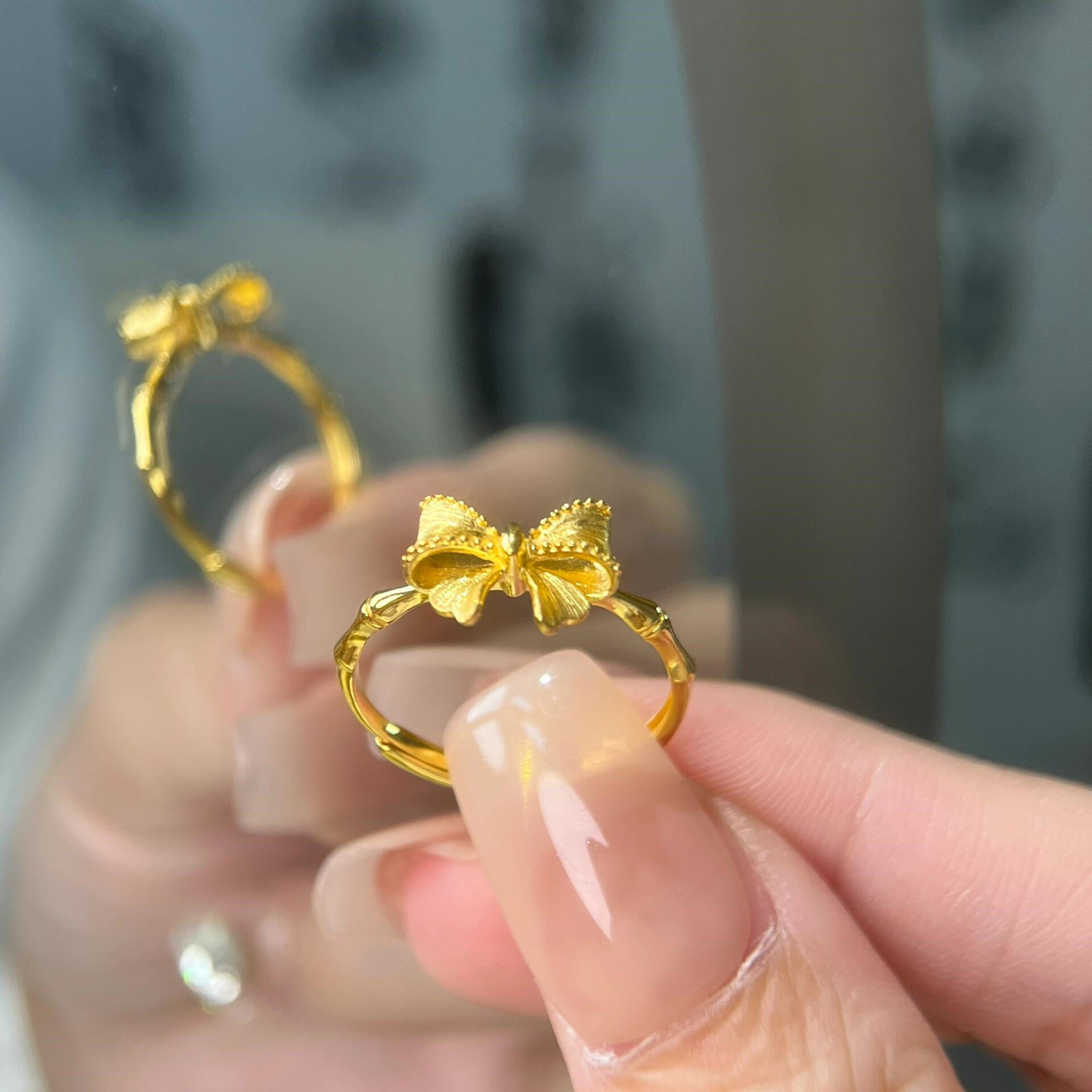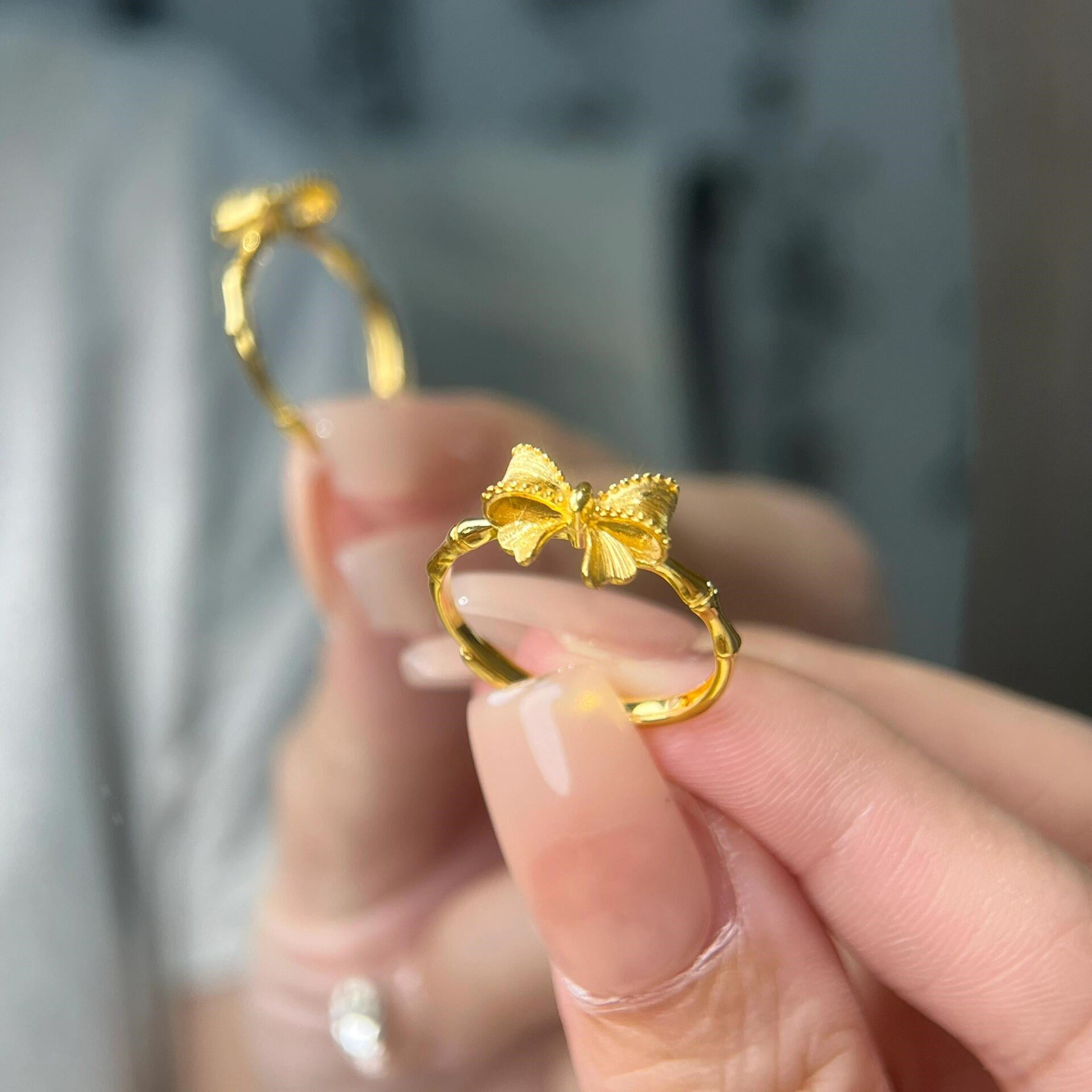 蝴蝶与竹超仙金黄色甜美精致竹节蝴蝶结戒指女清新艳丽感指环饰品