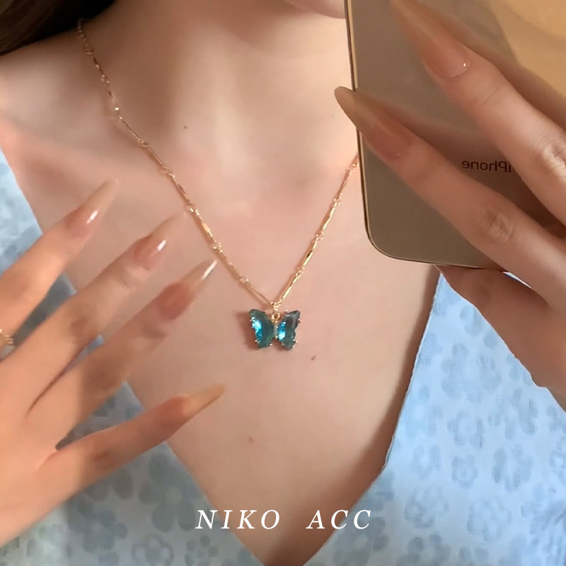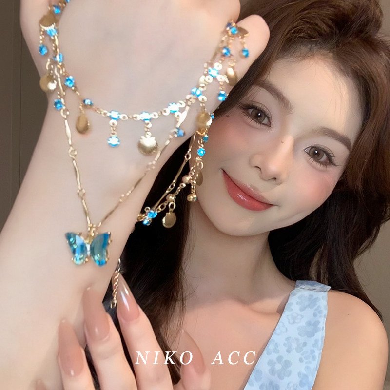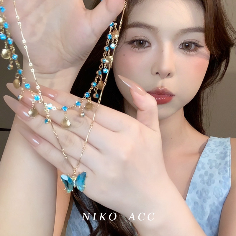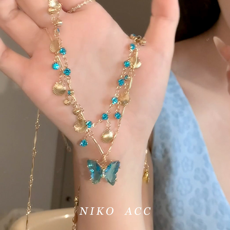 这个夏天~蓝色锆石贝壳流苏蝴蝶项链女绝美双层颈链高级感锁骨链