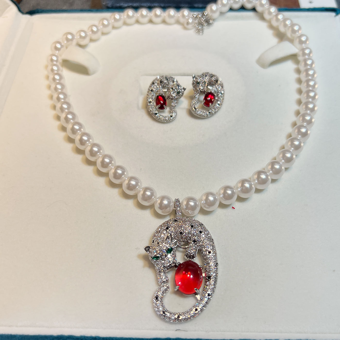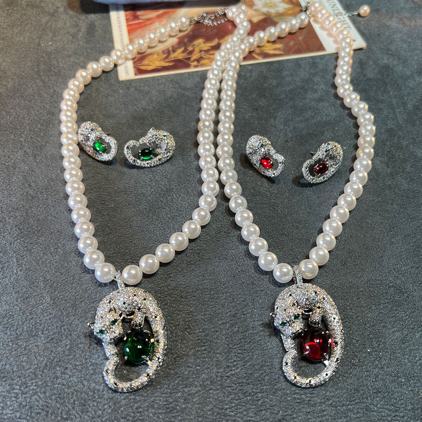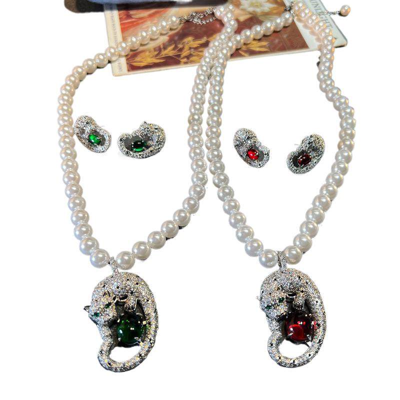 【原创设计】豹子珍珠个性套装高级感红色绿宝石高级vintage项链