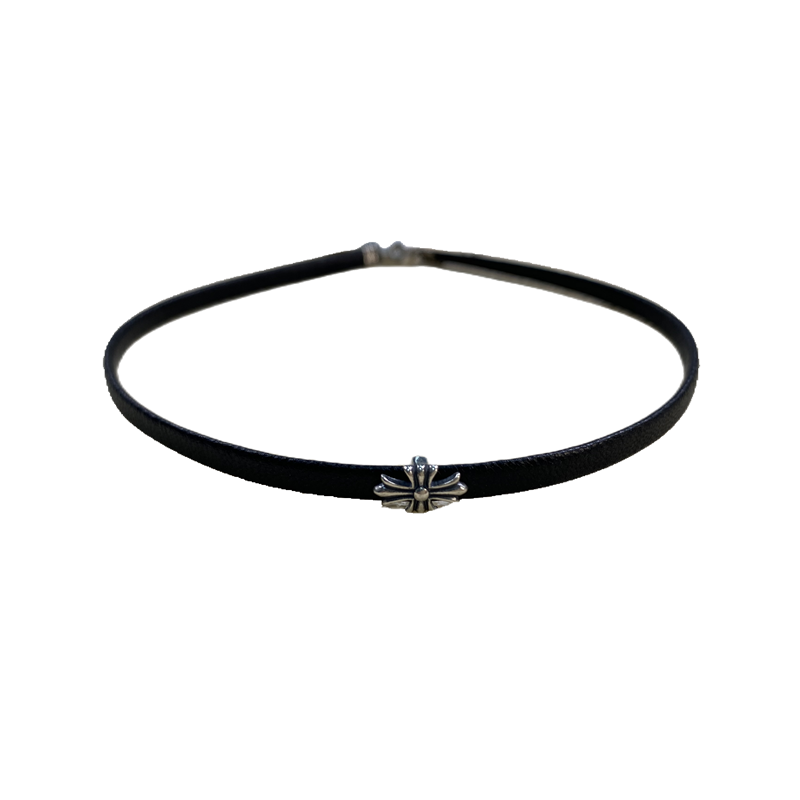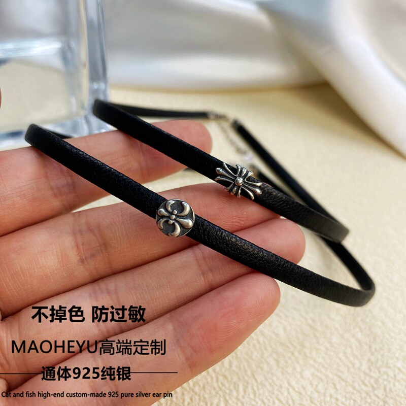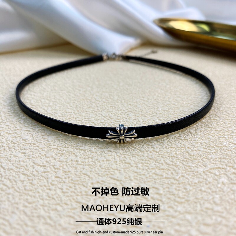 不掉色S925纯银十字架黑色皮绳项圈女choker颈链朋克复古甜酷辣妹