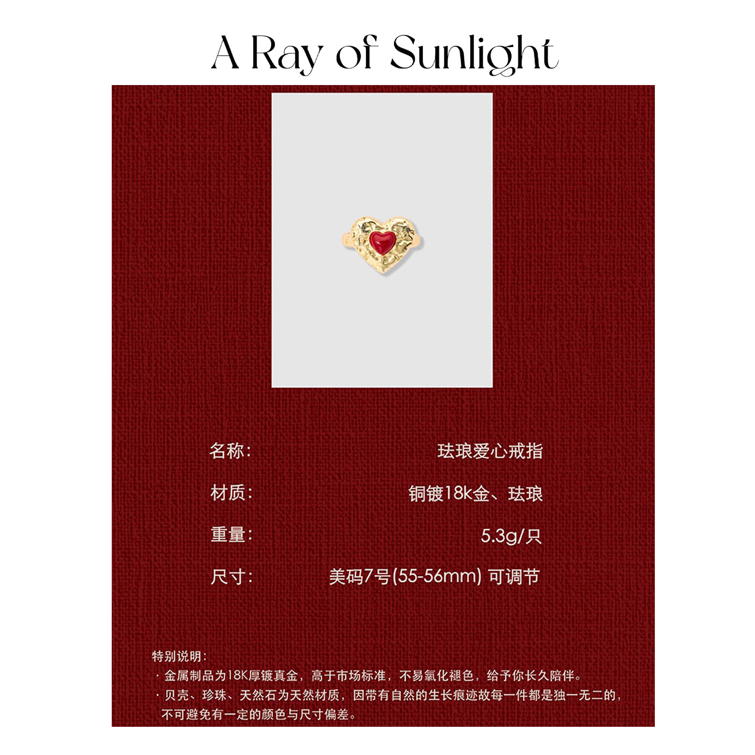A Ray of Sunlight「Love」节日系列珐琅爱心戒指女红色新年圣诞