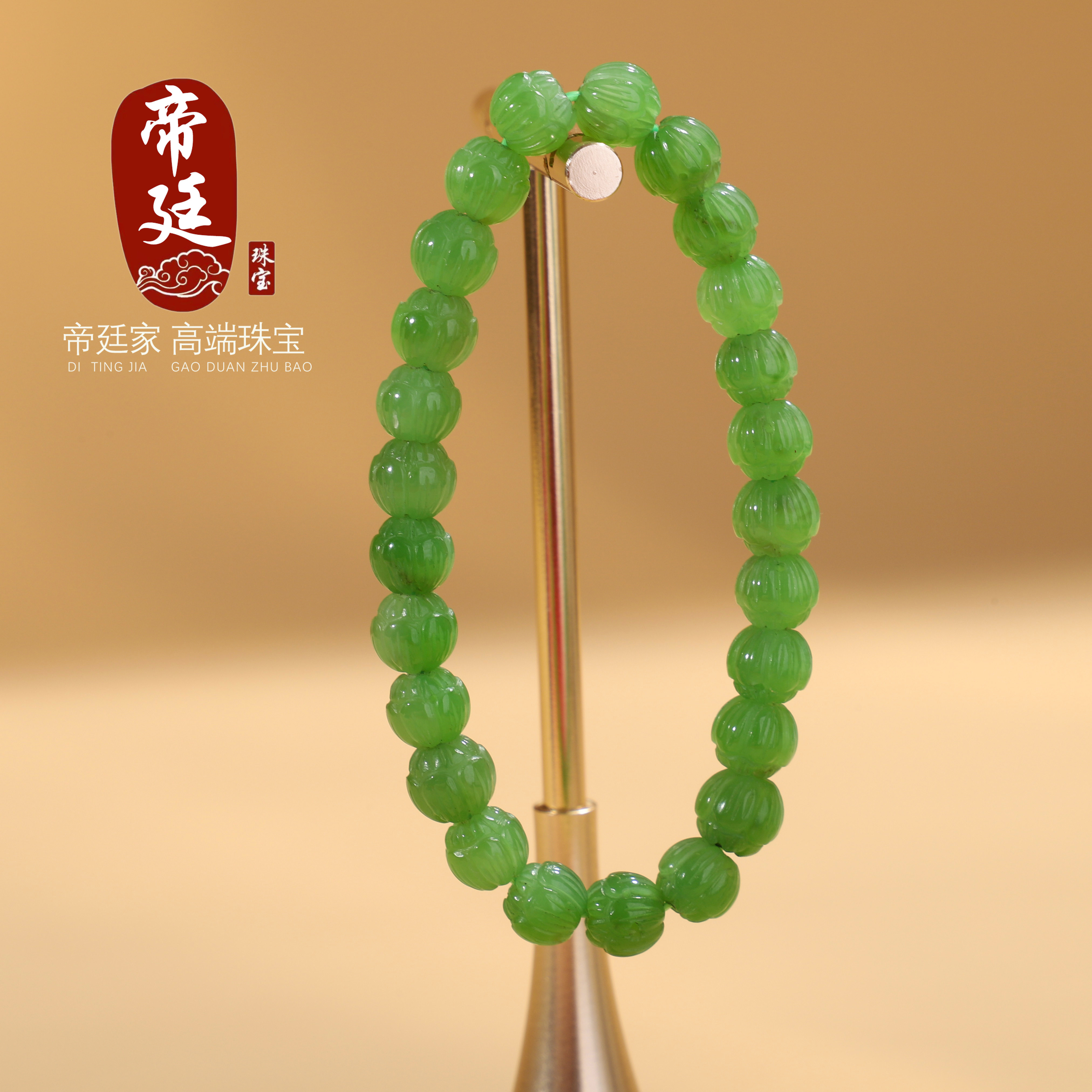 天然正品俄料碧玉 莲花珠手串 单圈7.5mm 果绿色 精工雕刻珠 素串