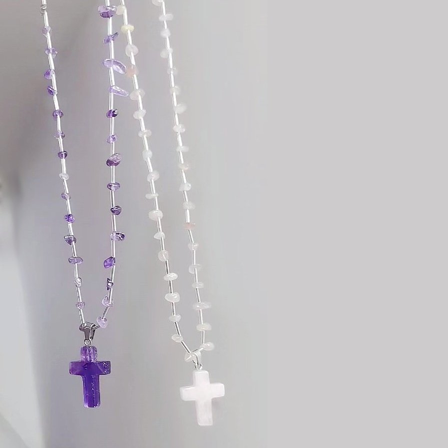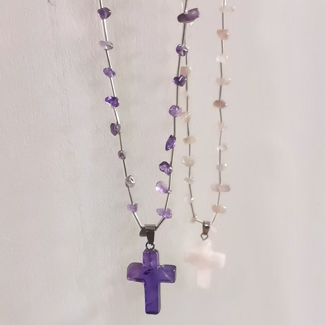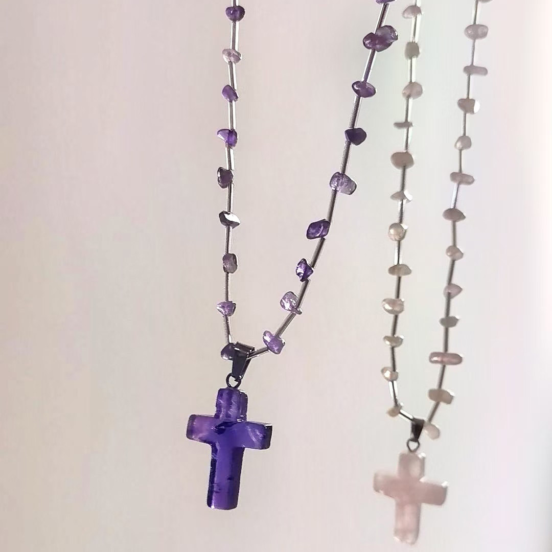 天然原石雕刻十字架 水晶紫晶粉晶东陵玉项链 果冻色冰润吊坠