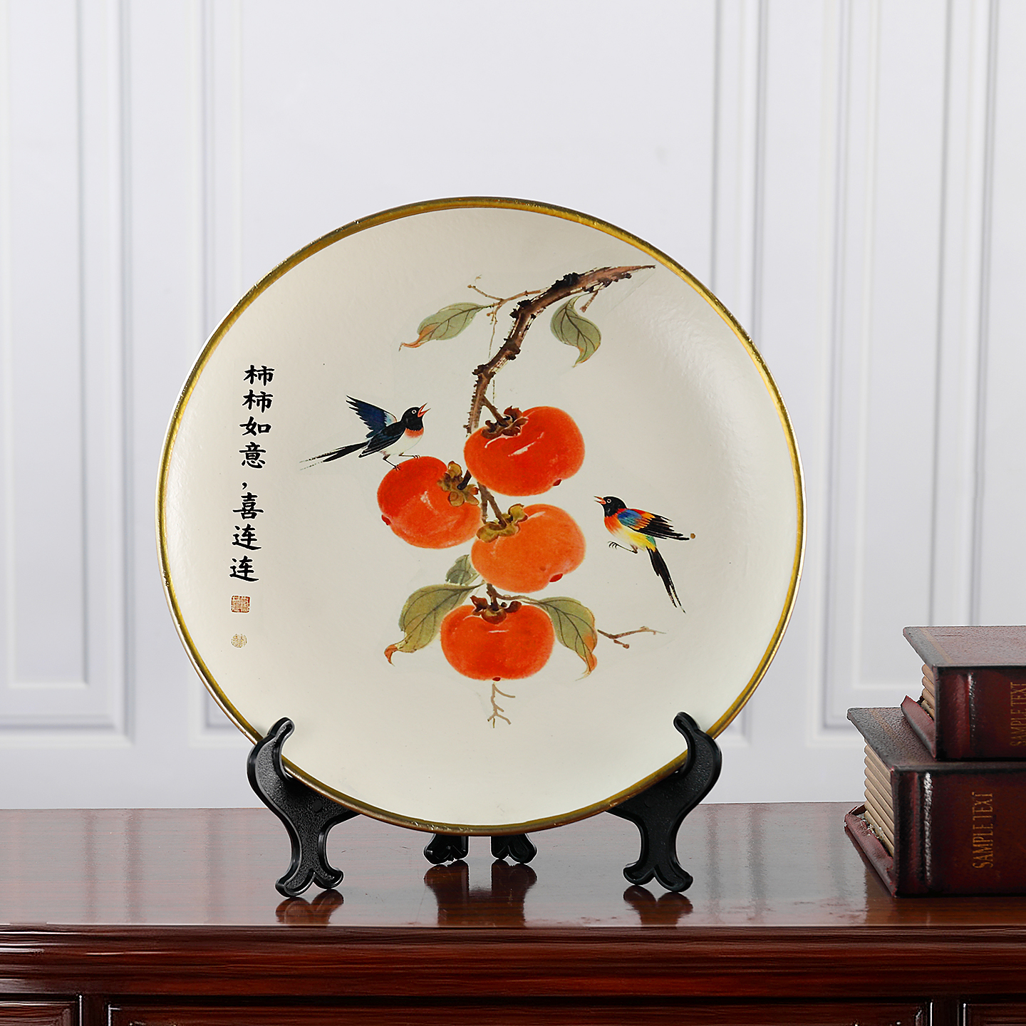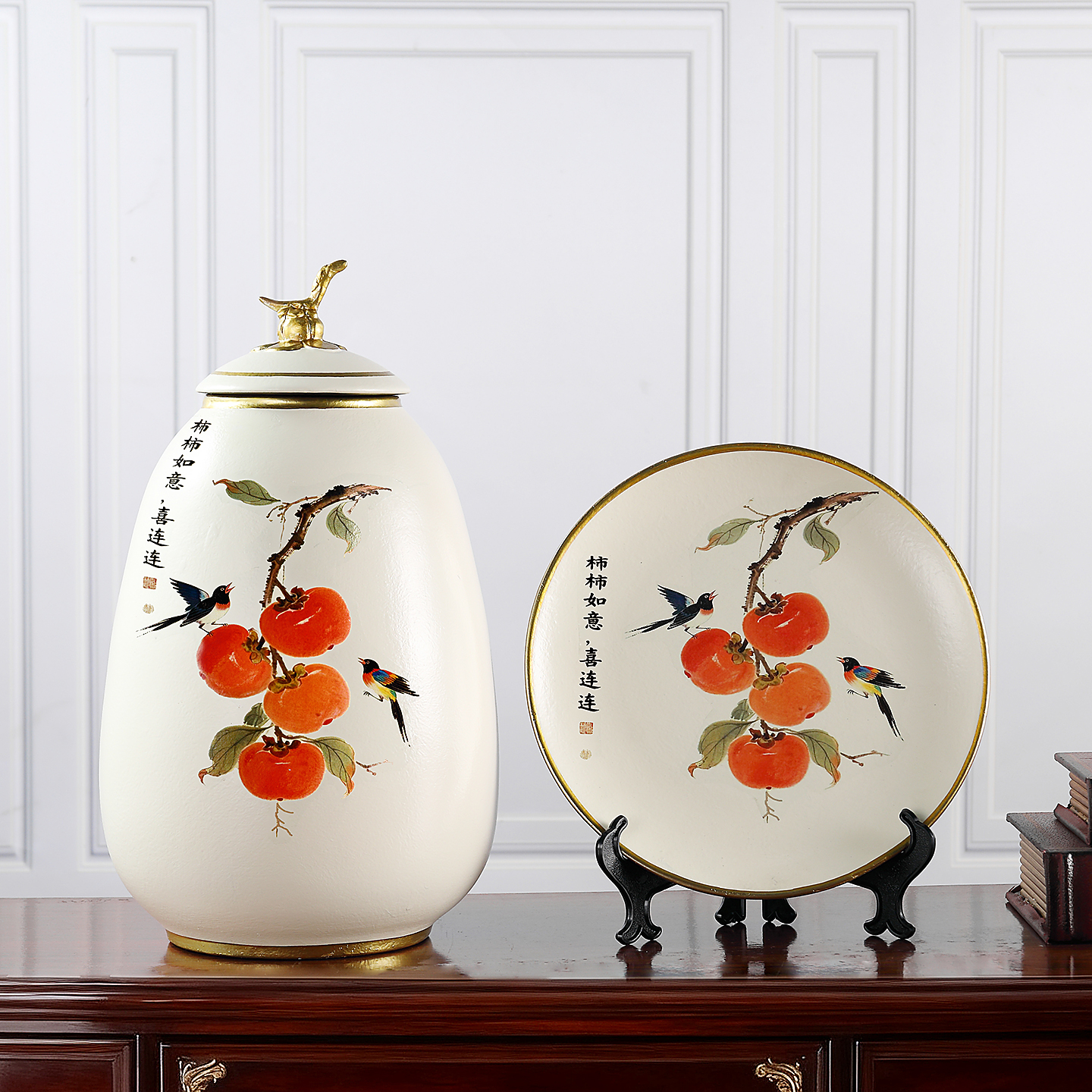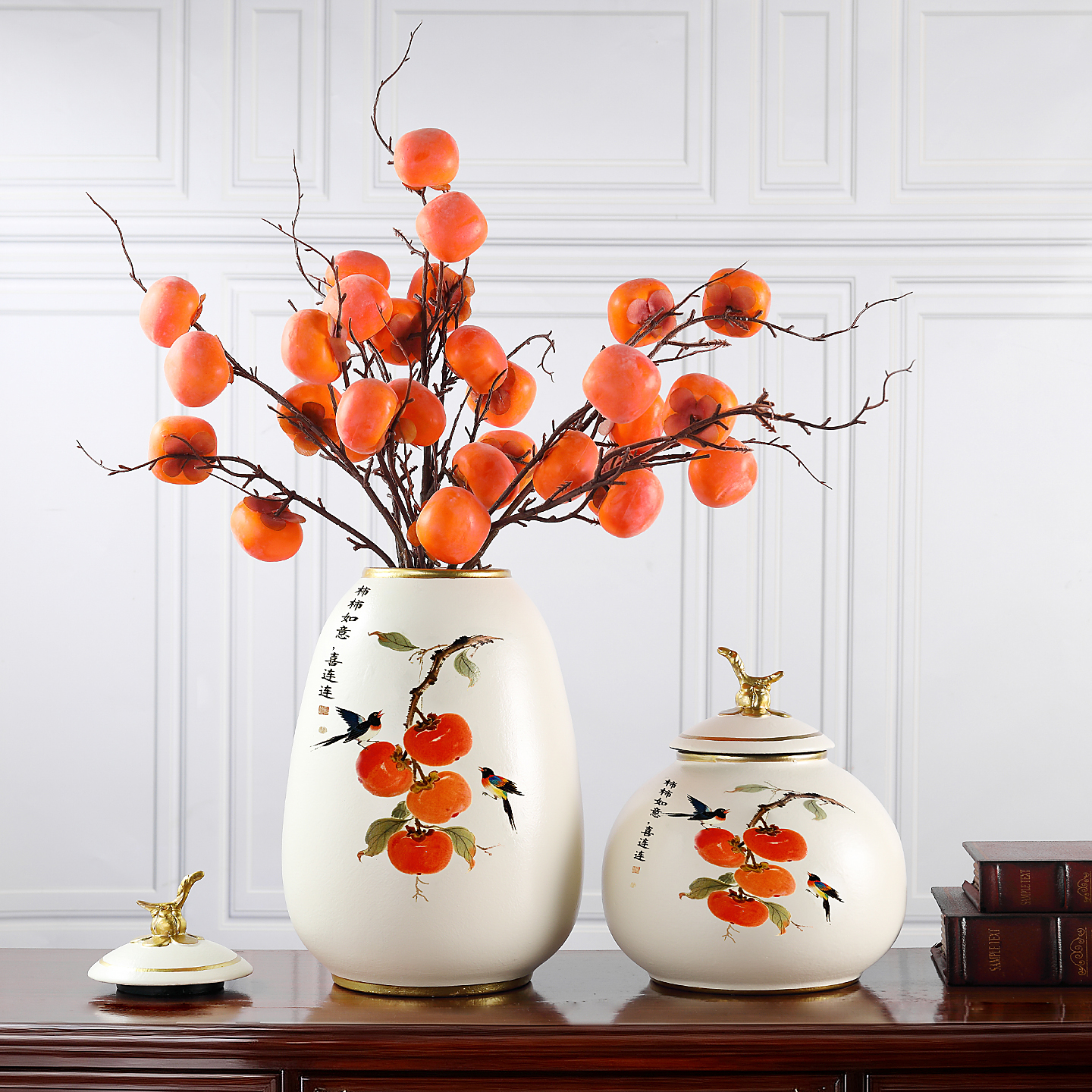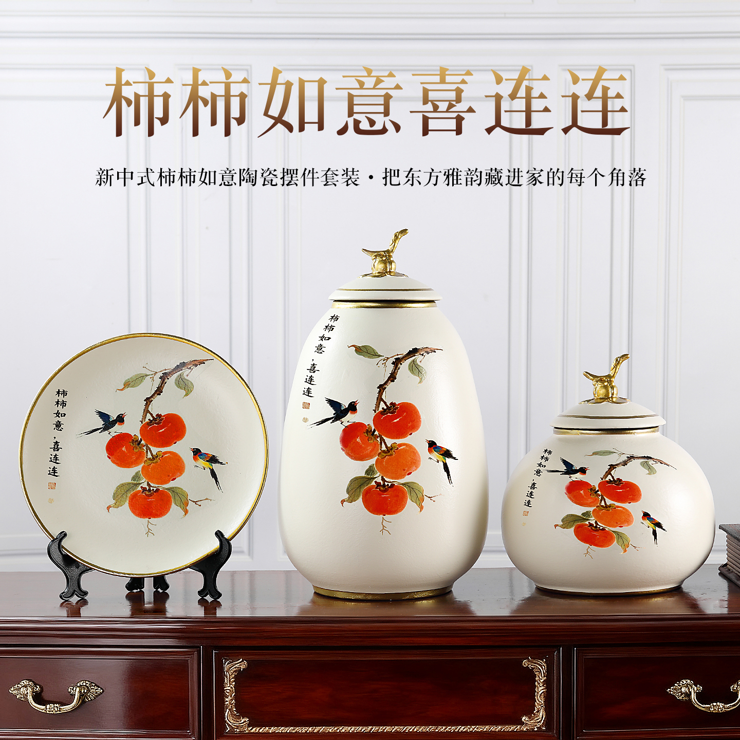 柿柿如意家居陶瓷摆件三件套高档奢华中古风原创设计客厅玄关装饰