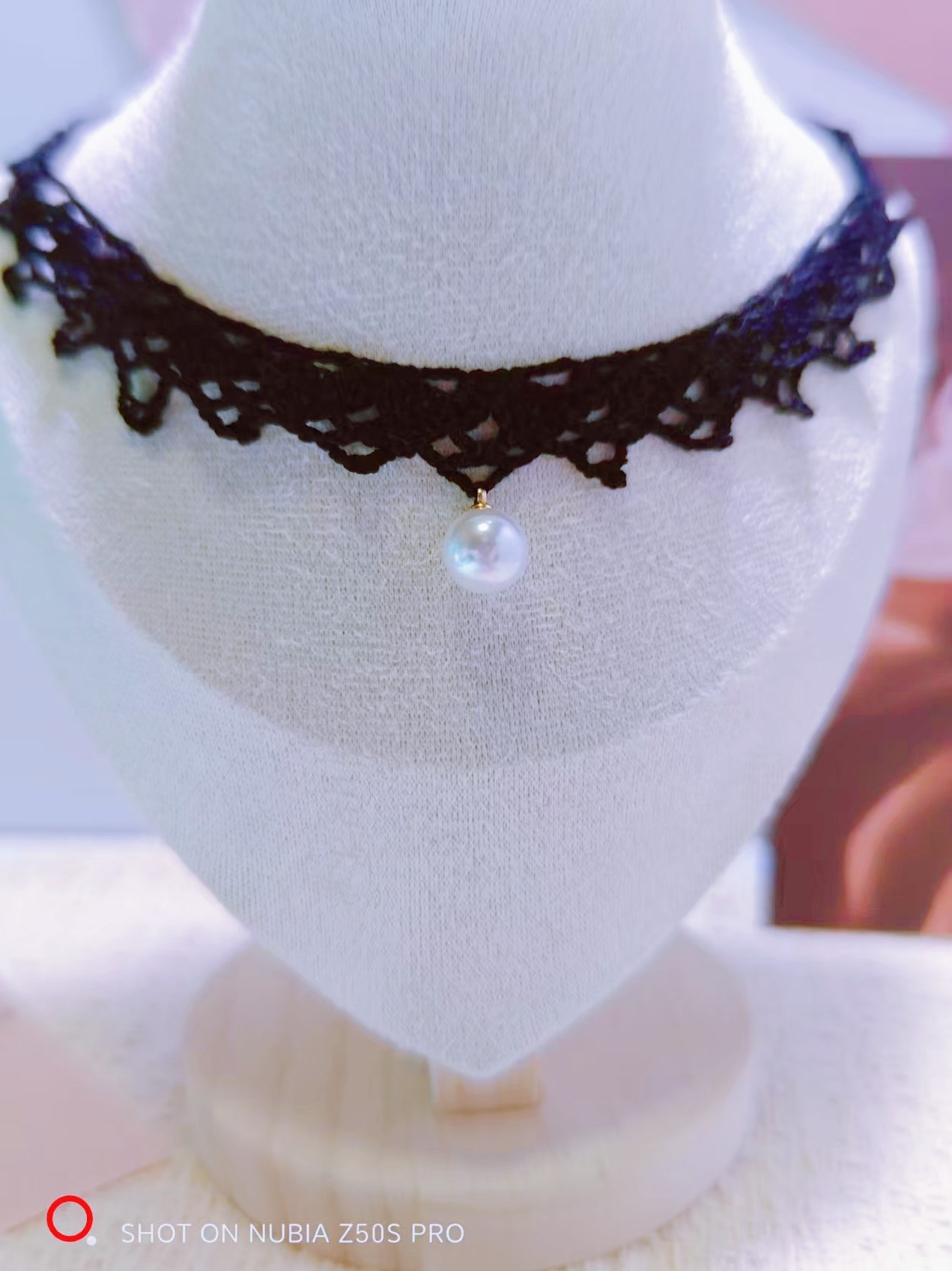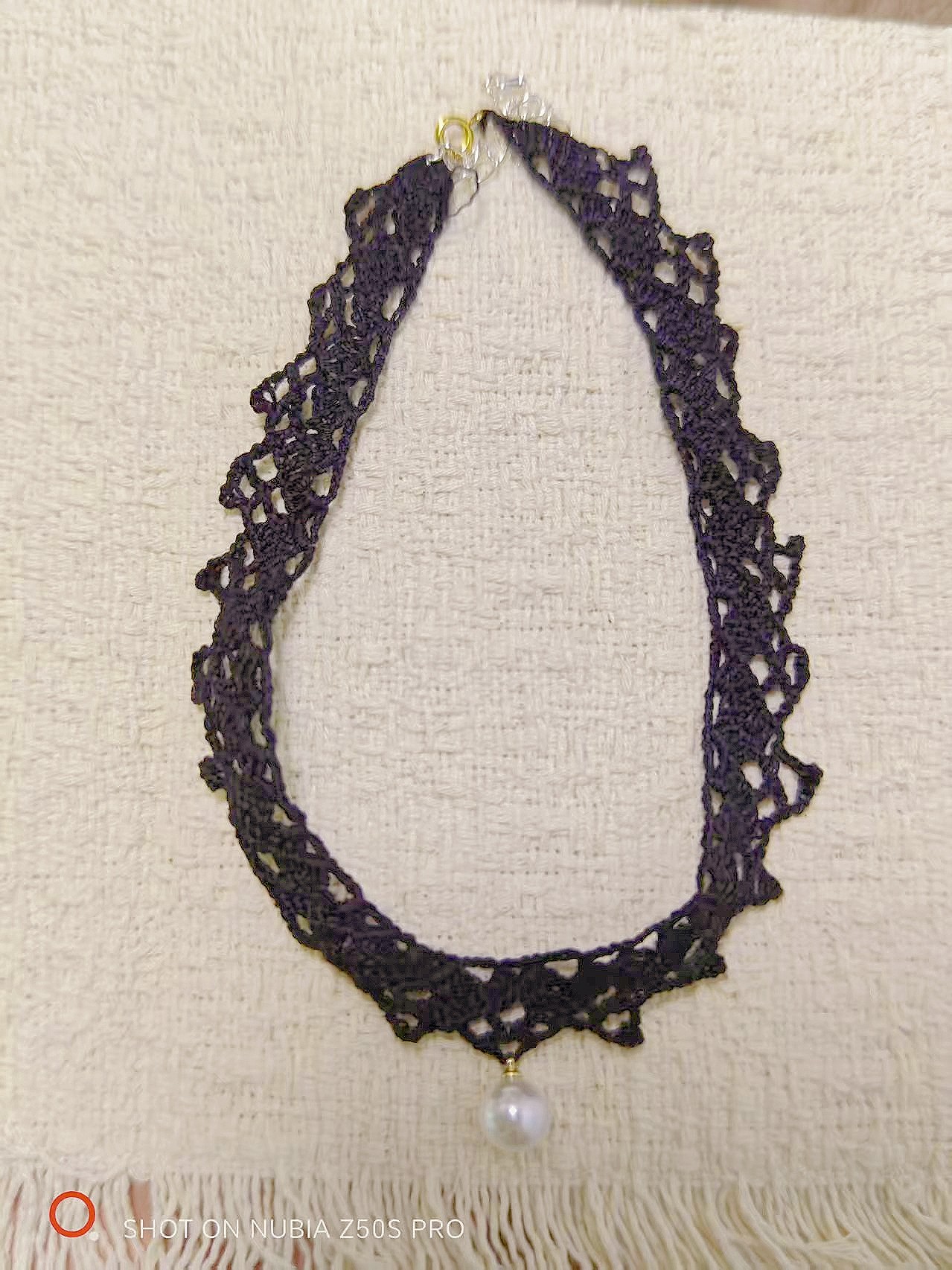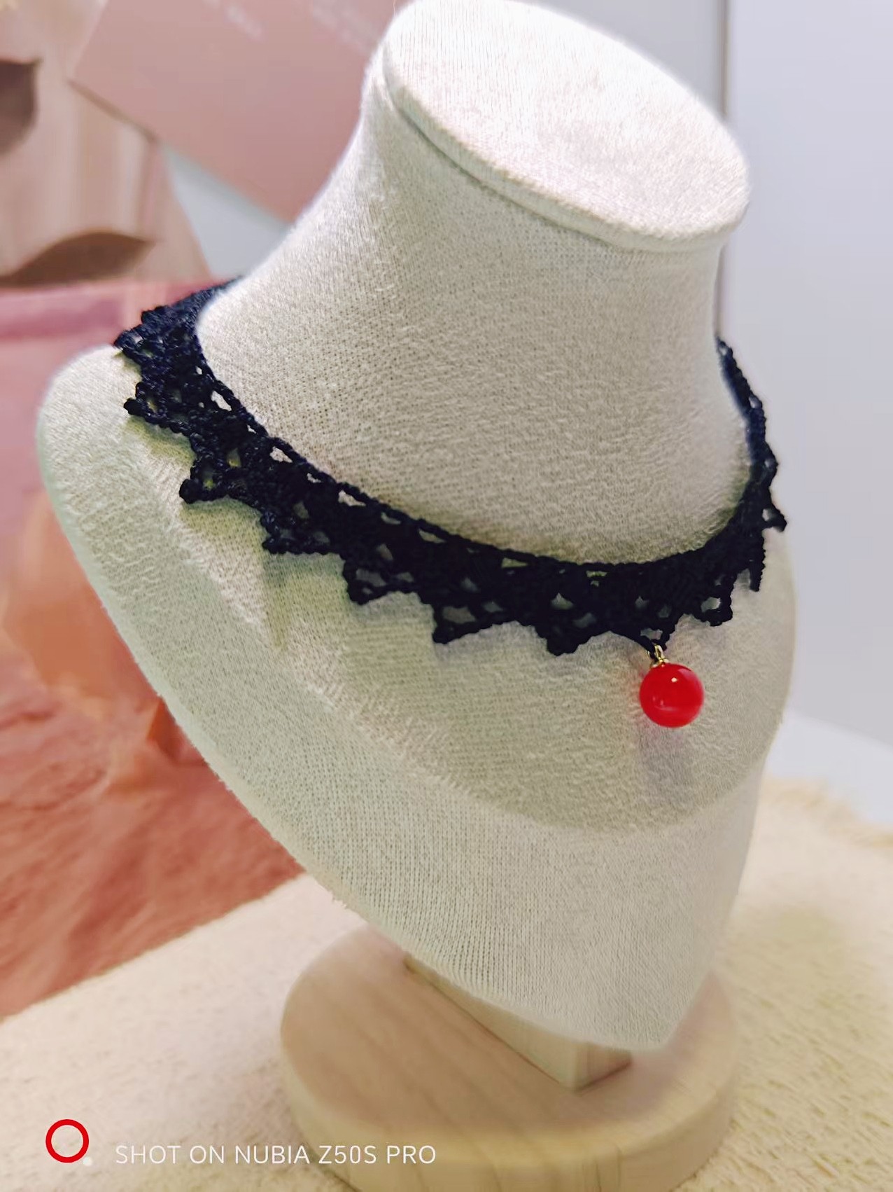 黑色白色蕾丝带红色珠珠吊坠链子可调节戴很显气质