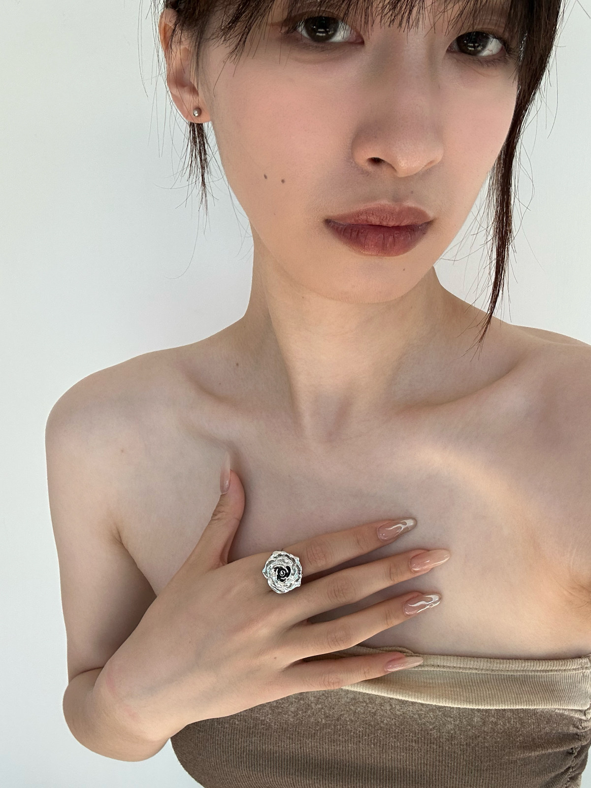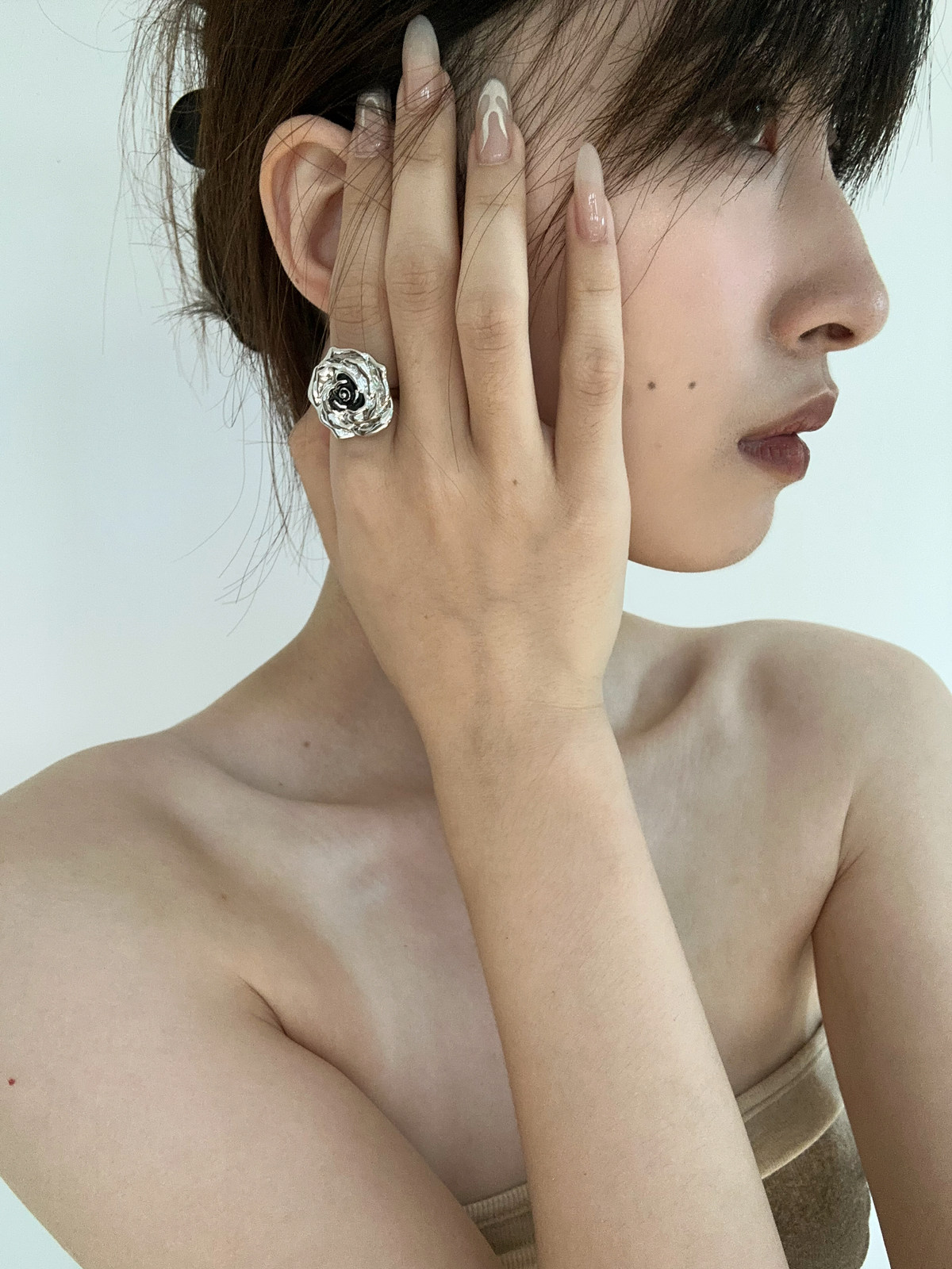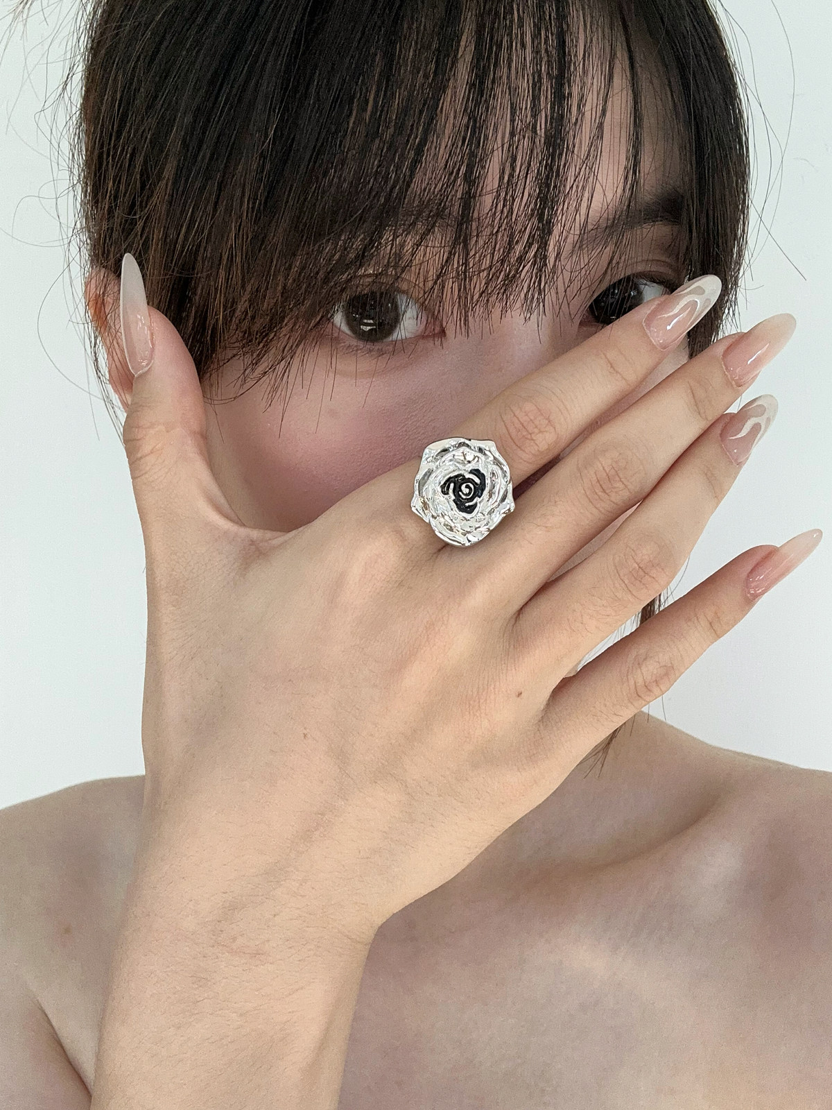 atmshop 法式银黑色立体玫瑰花朵复古戒指ins冷淡风高级食指戒