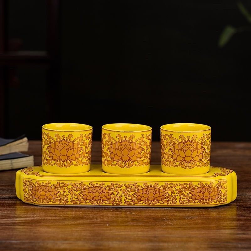 招财三杯座陶瓷水杯财神茶杯酒杯金莲莲花黄色杯供净水杯招财进宝