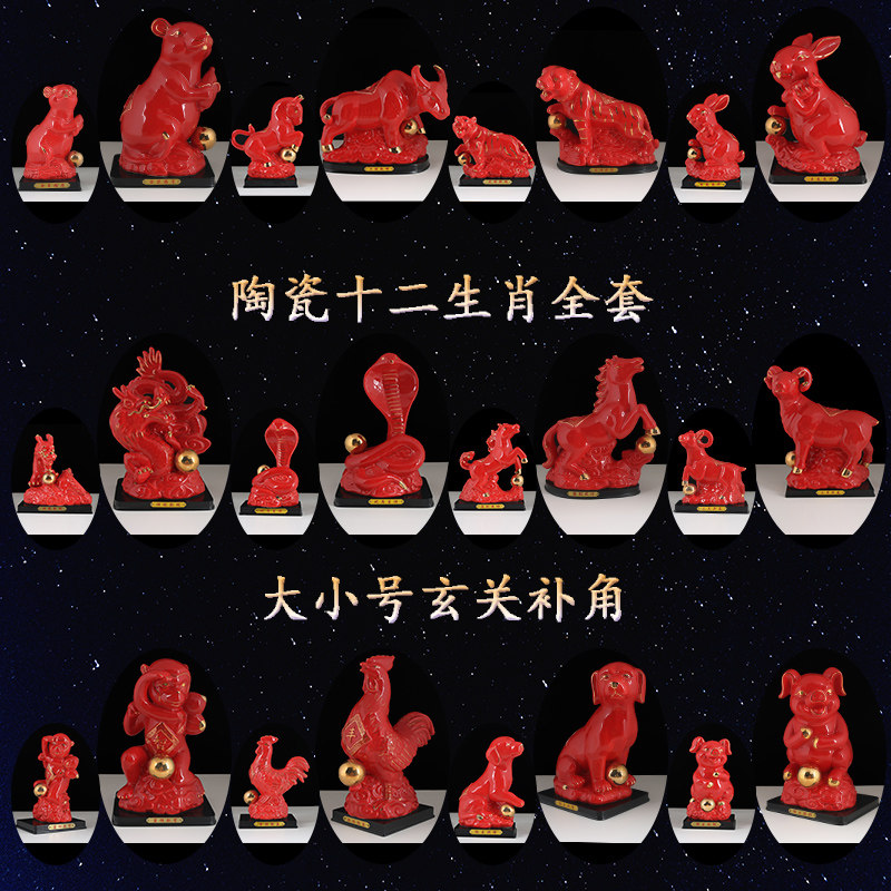 红色陶瓷全十二生肖摆件家居办公室招财玄关补角牛兔龙马羊狗猪