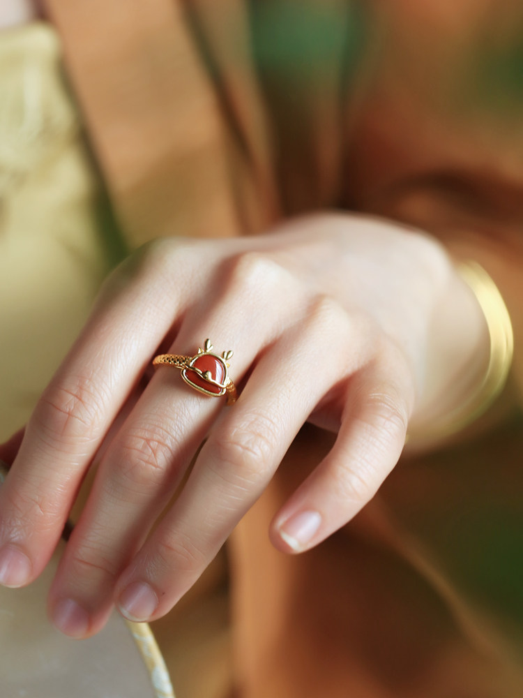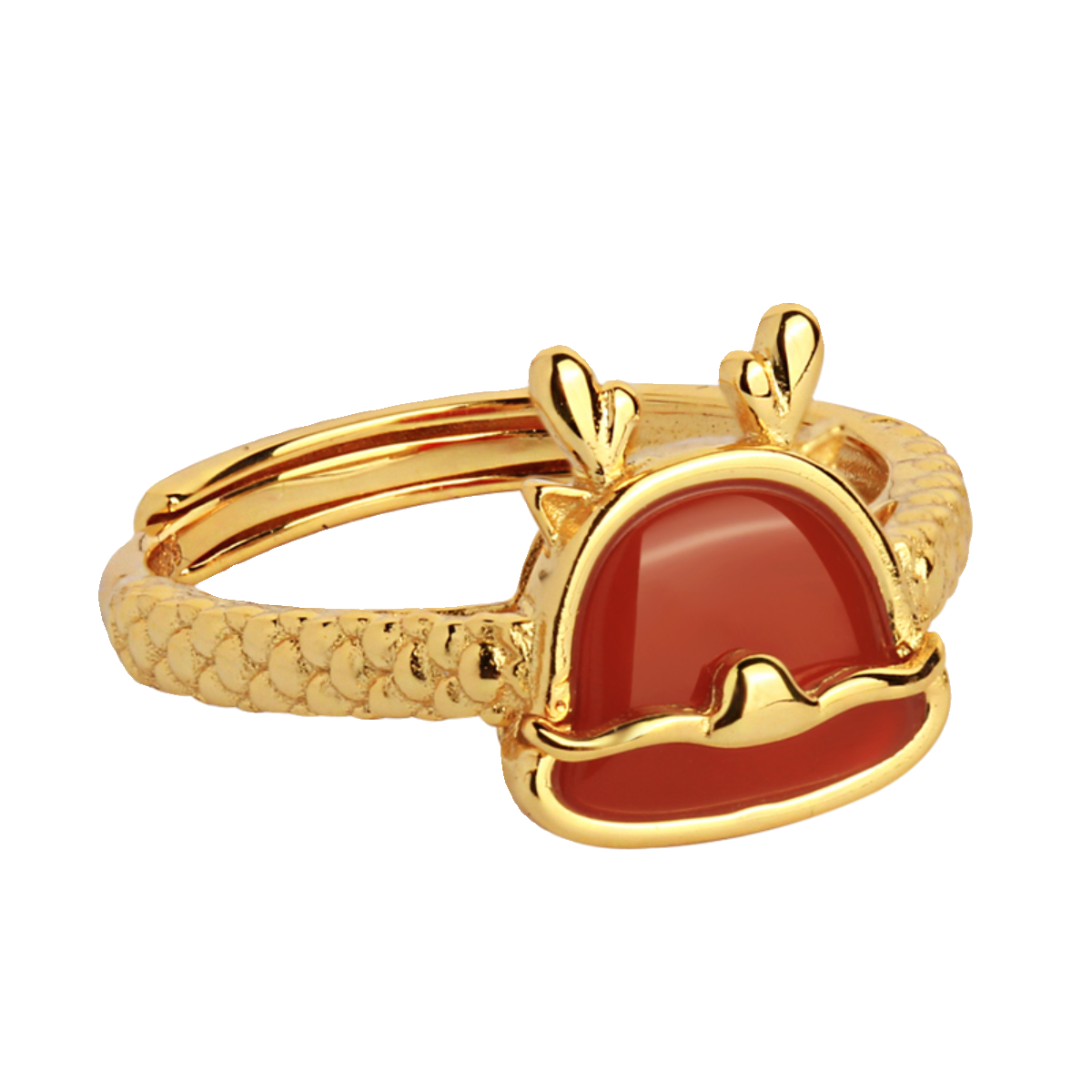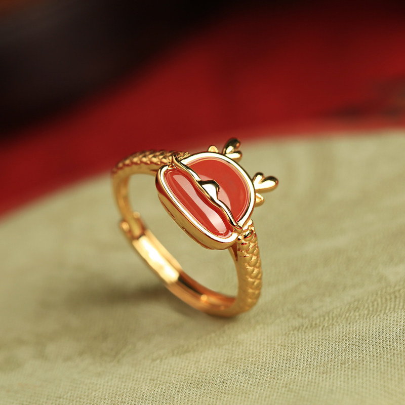 天然南红纯银小龙戒指女新中式国风轻奢红色复古红玛瑙金包银食指