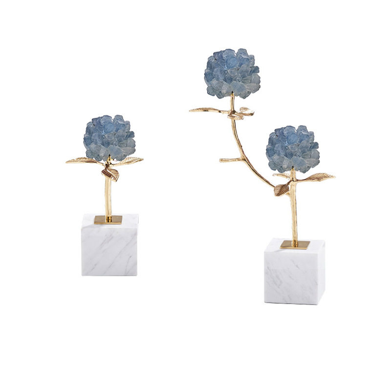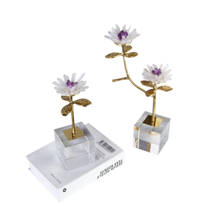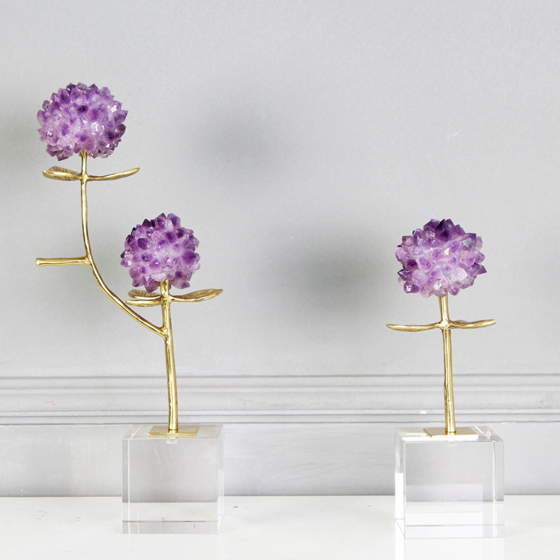 现代简约天然紫水晶花黄铜枝叶工艺品摆件样板间客厅玄关茶几装饰
