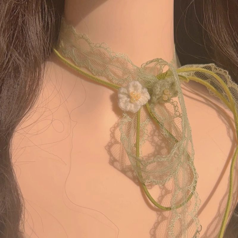 清新甜美绿色蕾丝花朵绑带双层叠戴项圈气质小众设计感颈带项链女