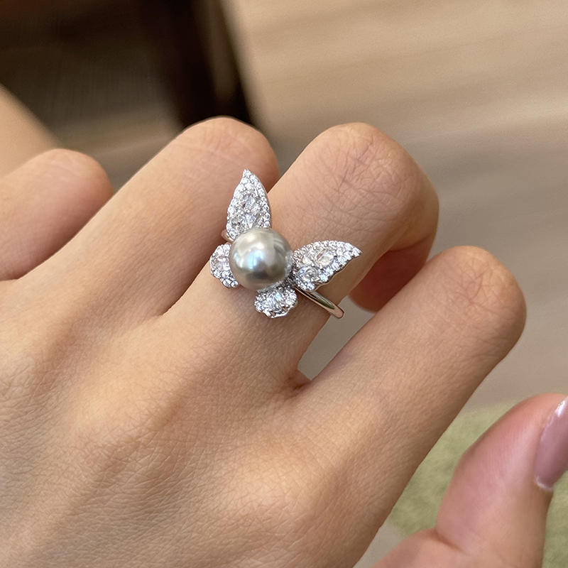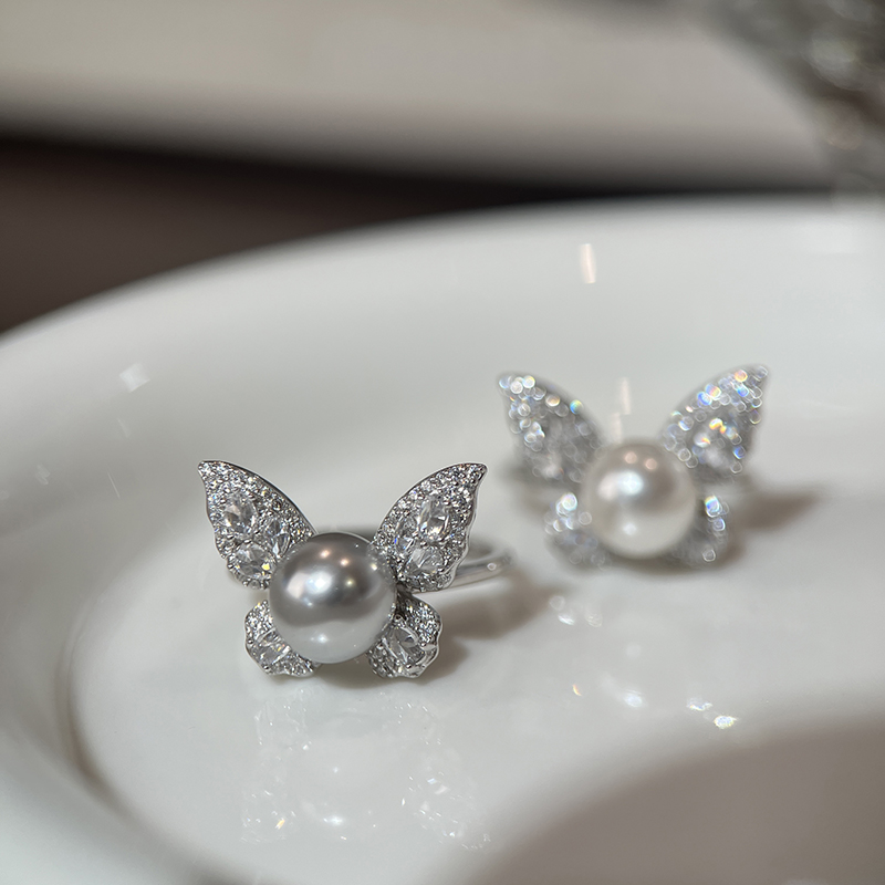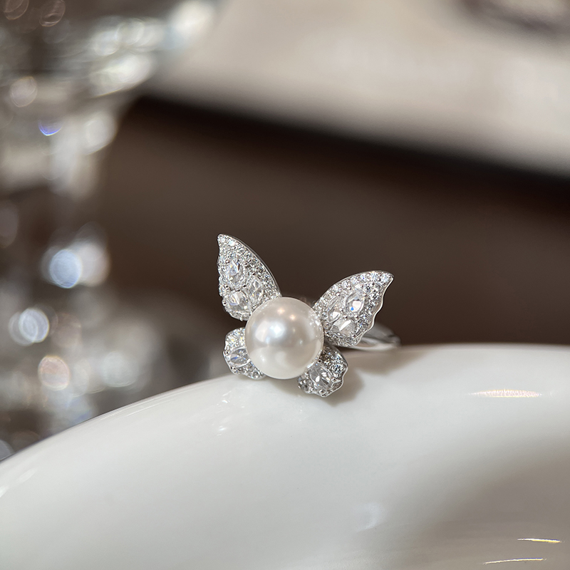 方糖家 轻奢小众纯银满钻蝴蝶珍珠戒指时尚简约可调节食指戒女款