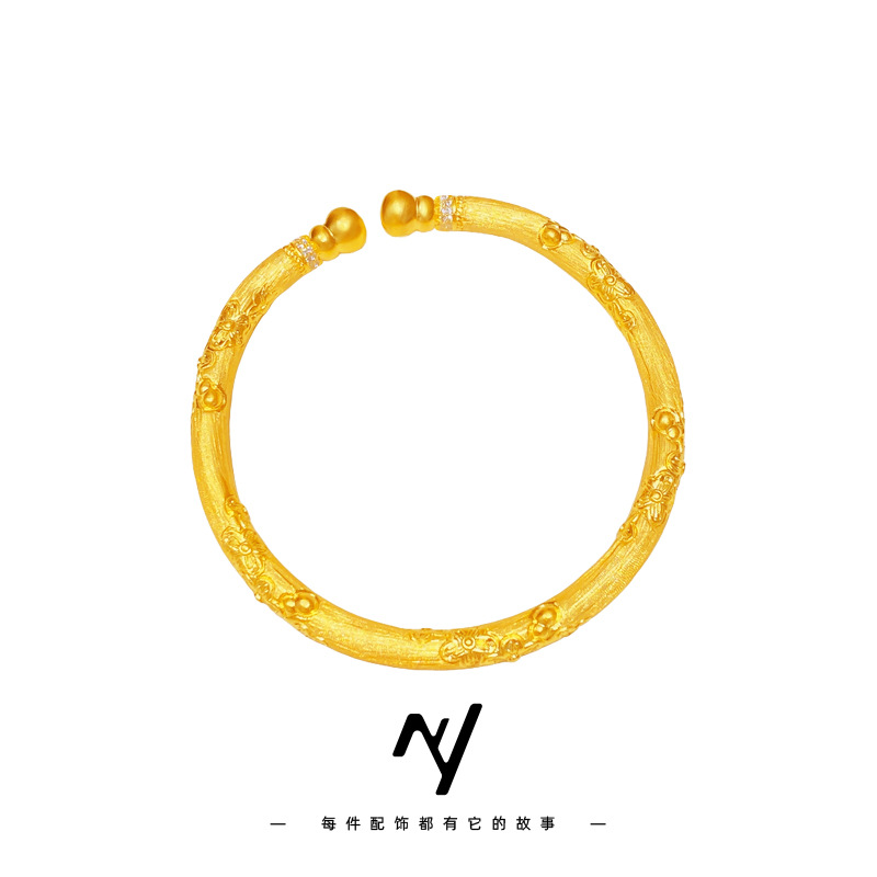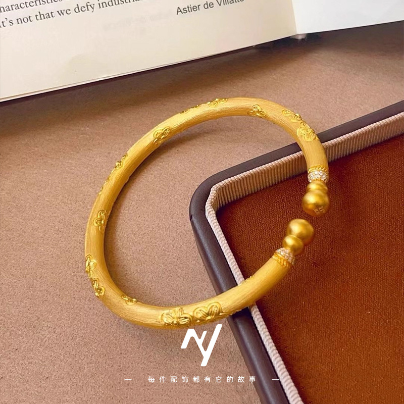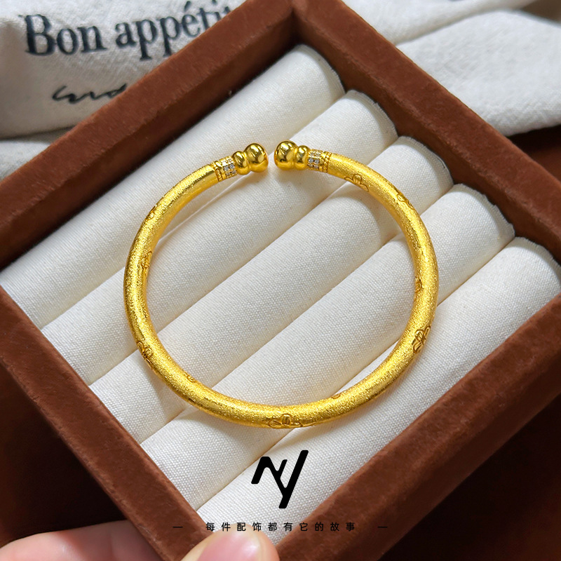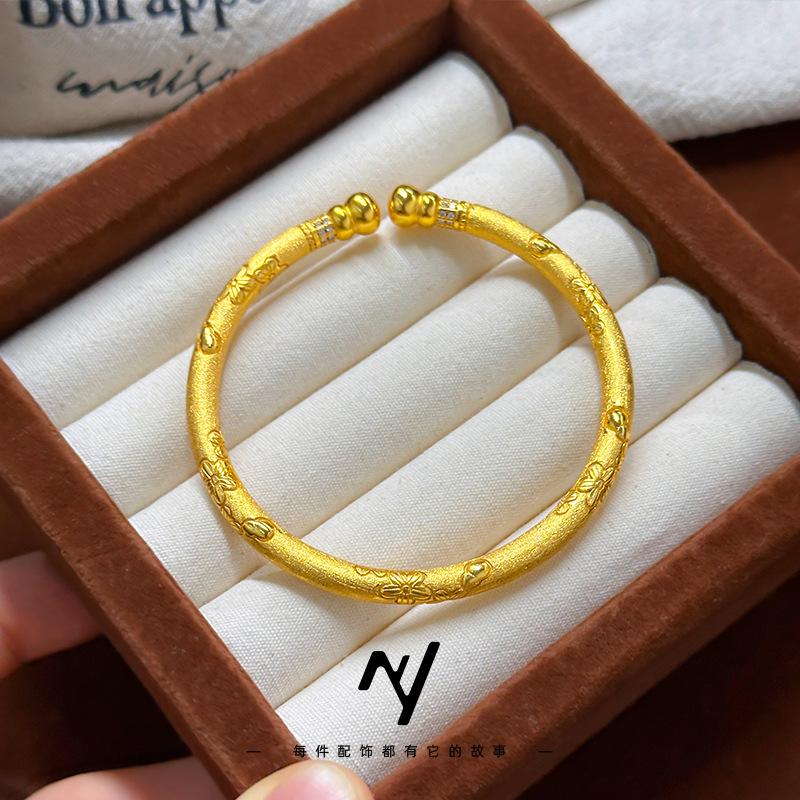 古法越南沙金黄色拉丝樱花葫芦开口手镯女轻奢精致新中式古风手环