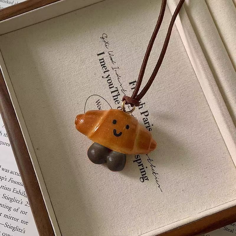 可爱小众设计碱水结面包吊坠项链女秋冬牛角包长毛衣链配饰卫衣链