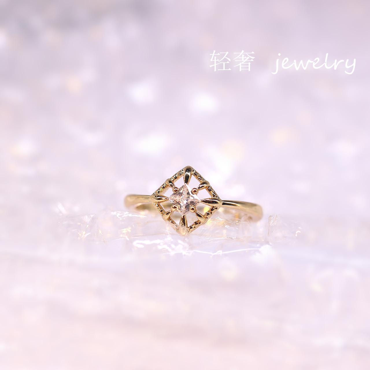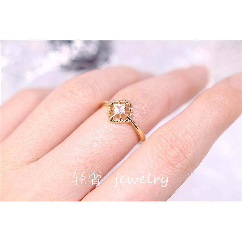 公主方钻戒指 女纯银镀黄金色镂空四叶草镶钻指环日韩简约冷淡风