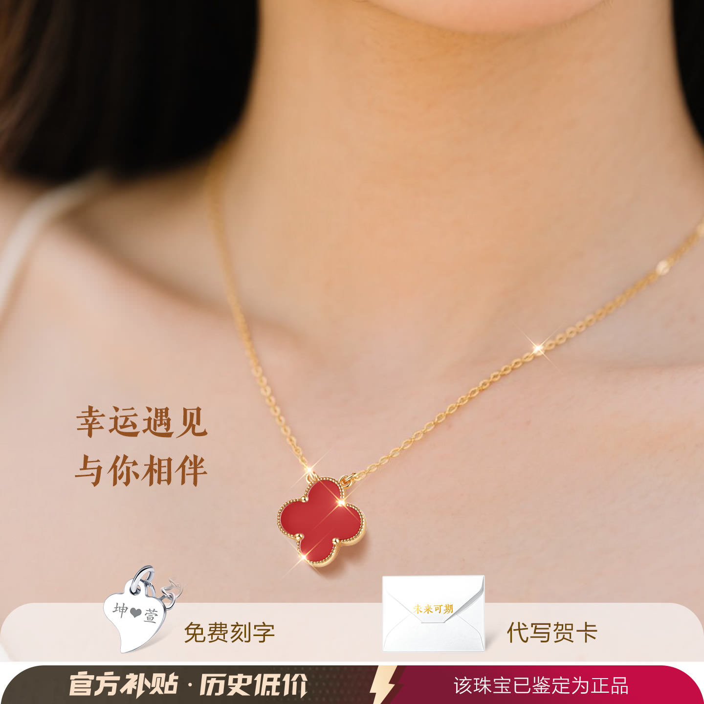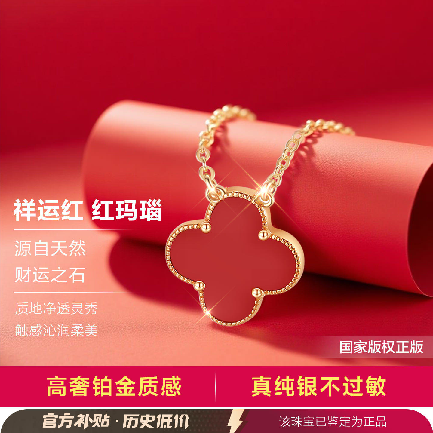 999纯银红玛瑙红色幸运四叶草银项链女款女本命年生日礼物送女友