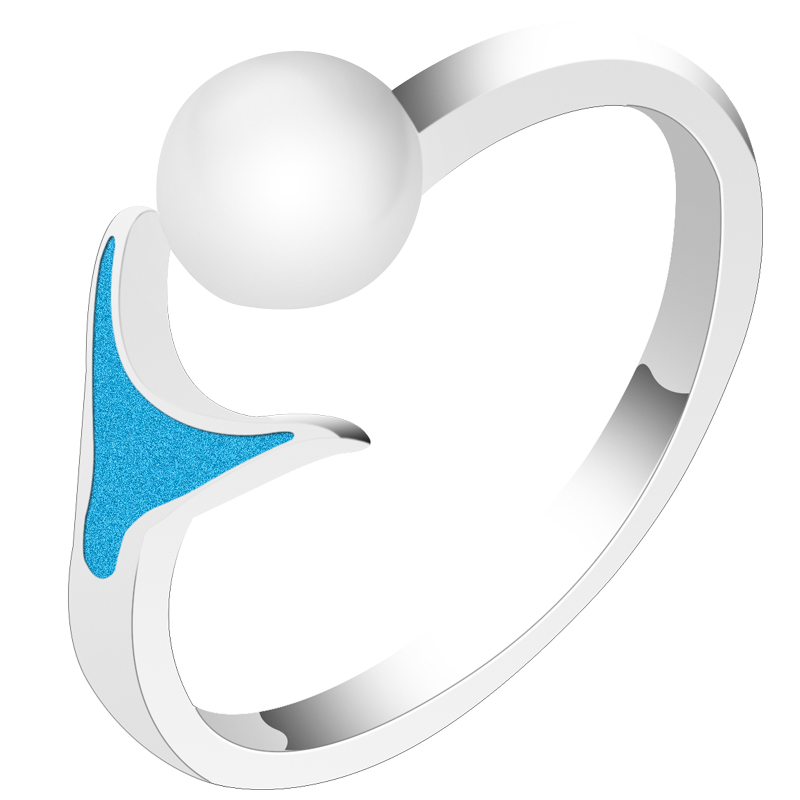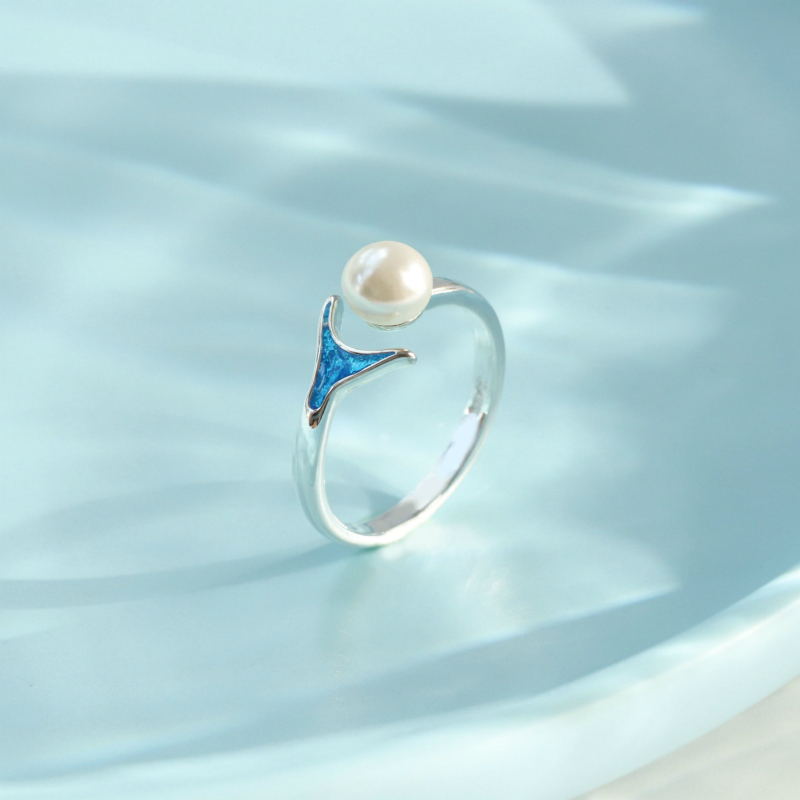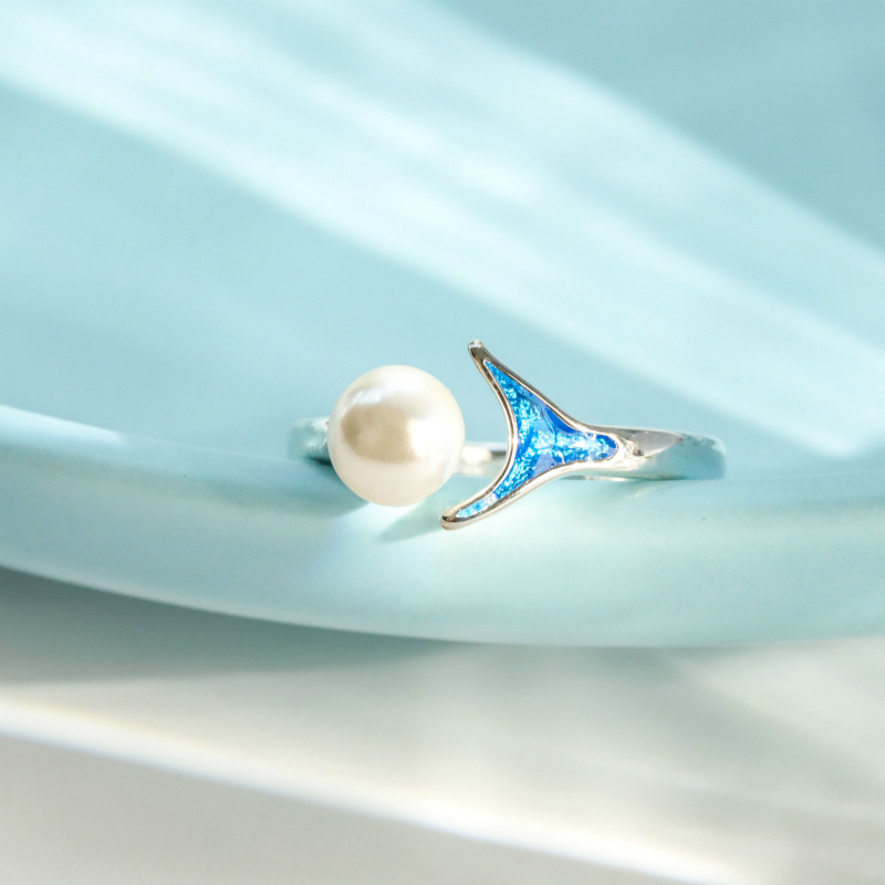 日韩潮人S925纯银饰品美人鱼鲸鱼尾巴珍珠小众设计开口戒指女指环