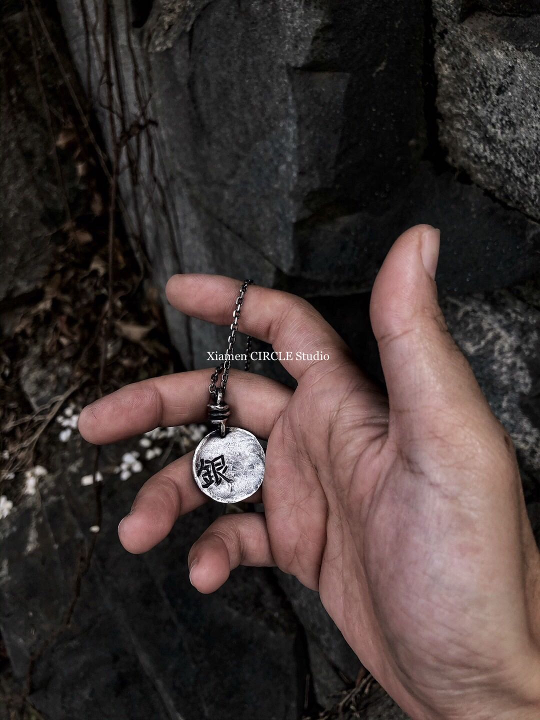 纯银圆牌项链刻字手工银饰来图订制设计 小众暗黑锻打哑光面