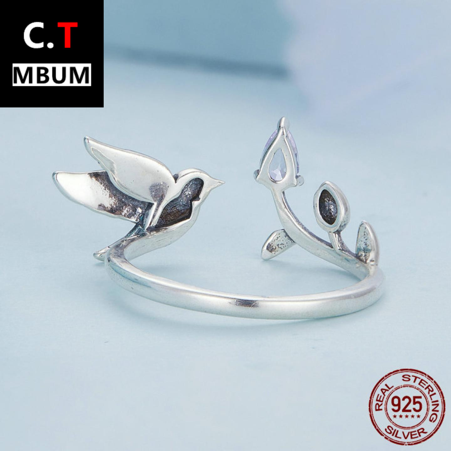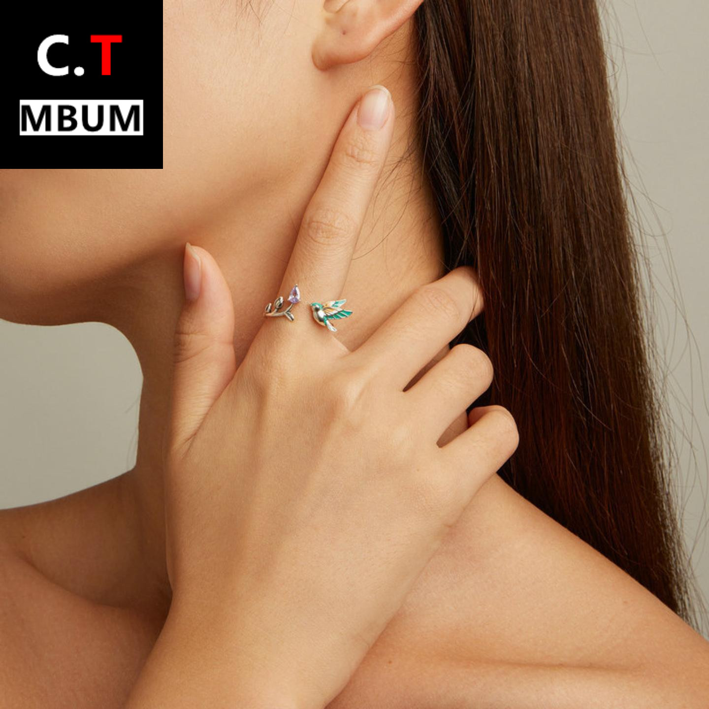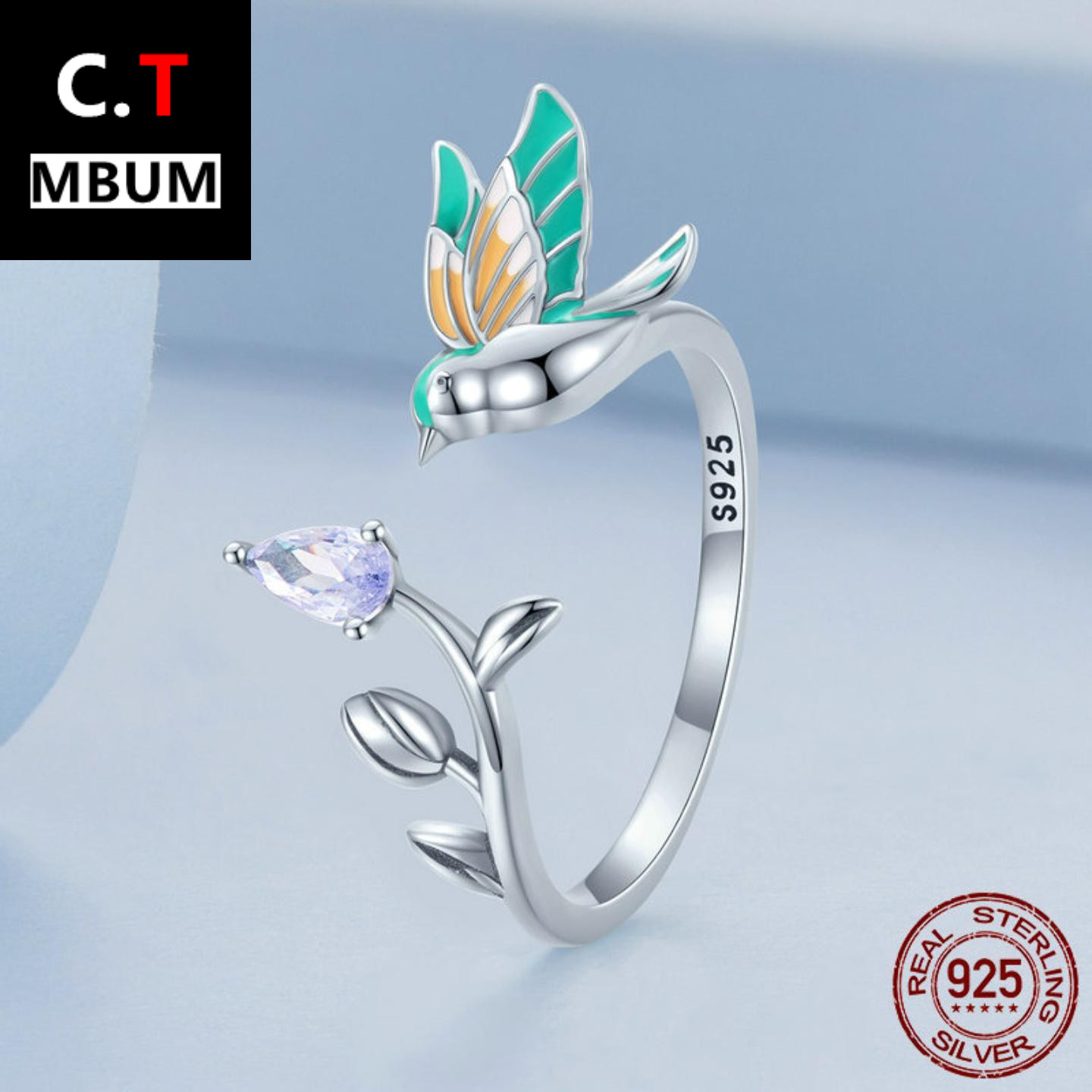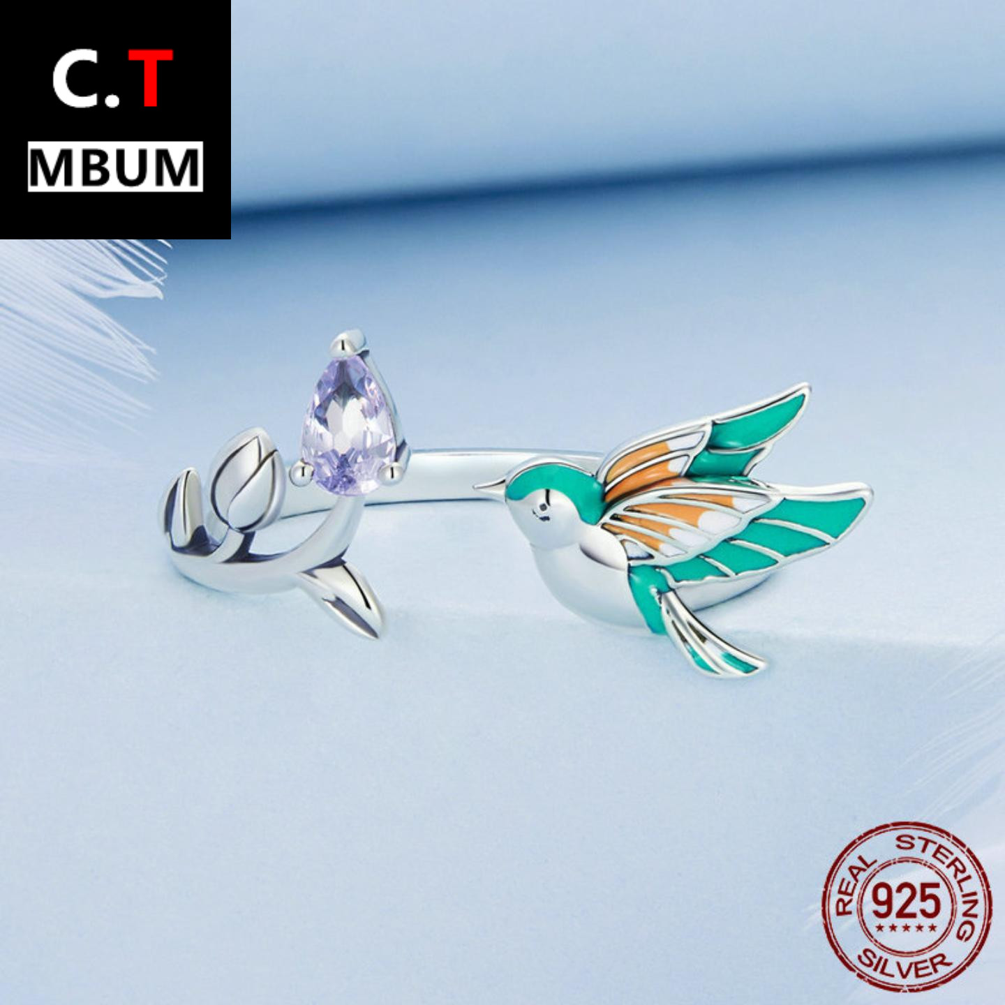 欧美原创纯银s925翠鸟开口戒指 绿色滴油锆石缤纷小鸟指环手饰女