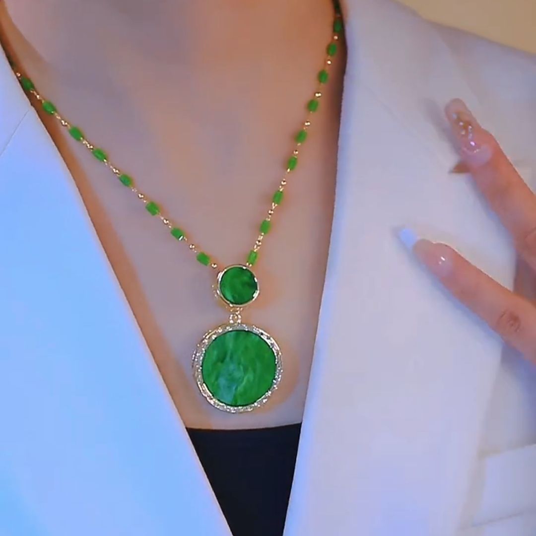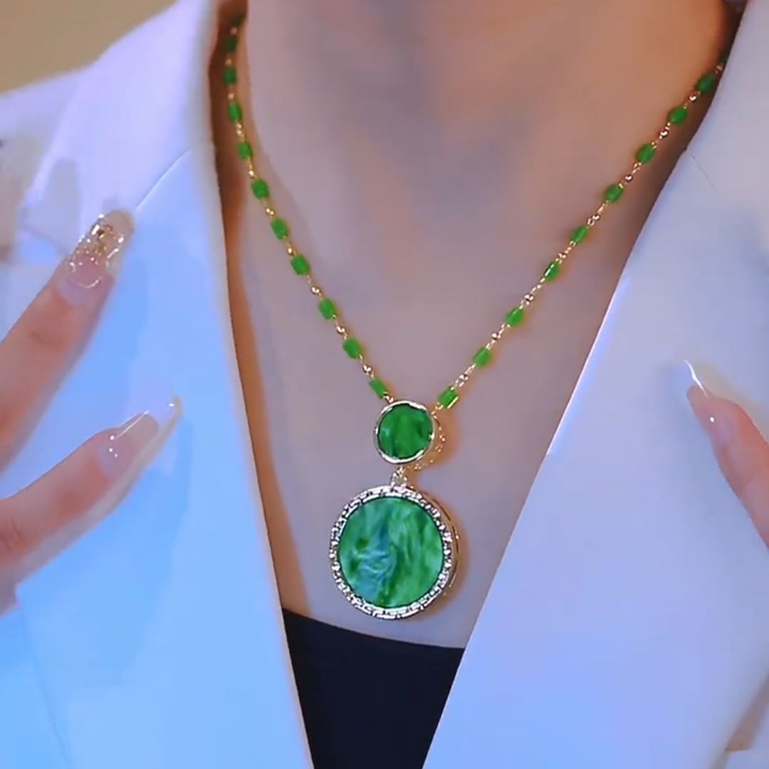 网红辣绿圆牌吊坠项链女轻奢气质高级感绿色竹节锁骨链无事牌配饰