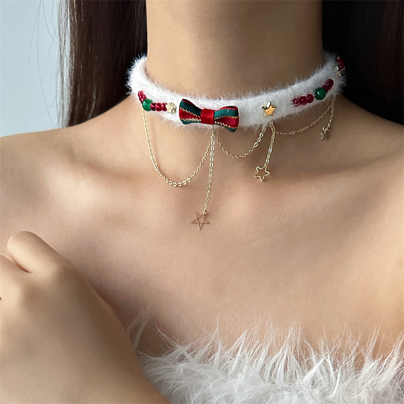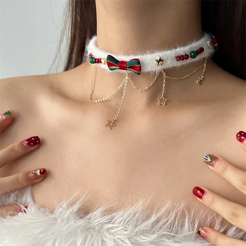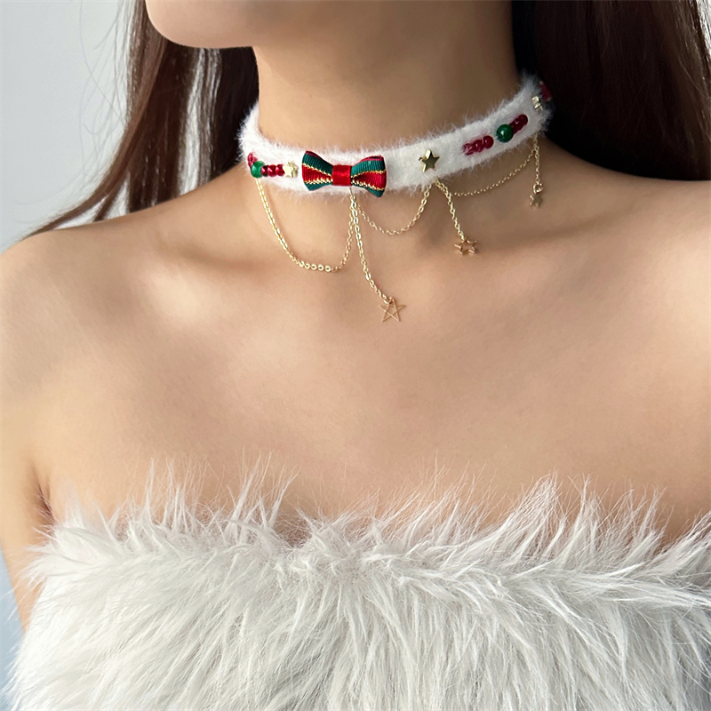 圣诞节白色毛绒蝴蝶结项圈女chocker项链秋冬脖子配饰高级感颈链