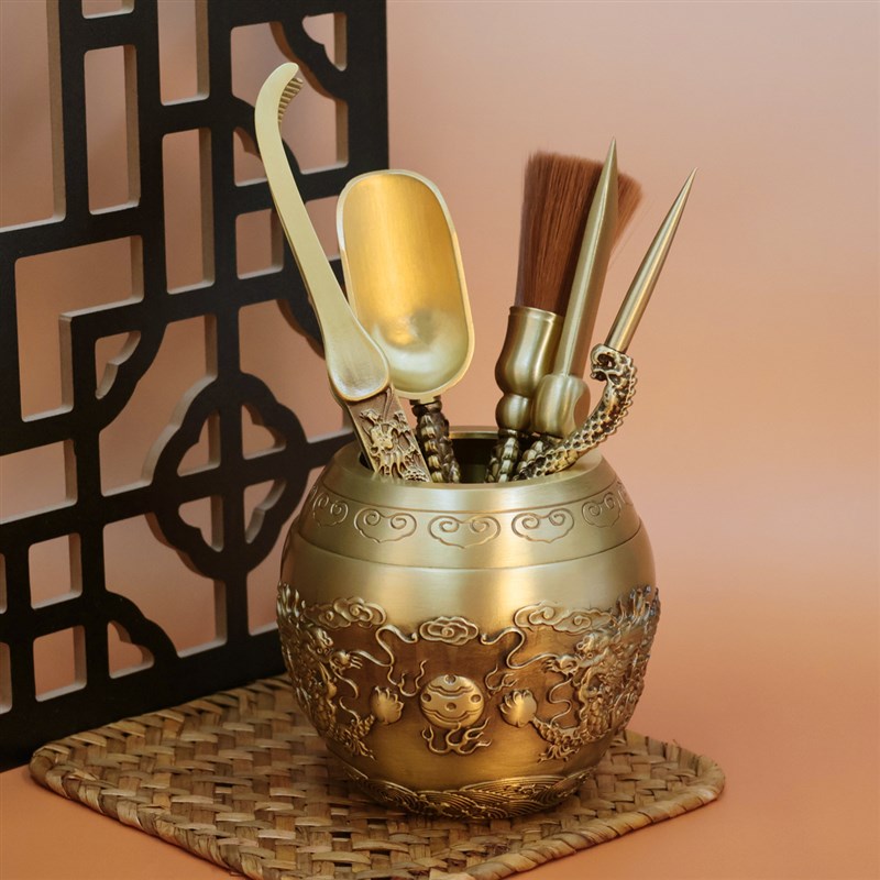 黄铜双龙戏珠茶具套装自用办公桌面摆件功夫茶配件礼品装饰工艺品